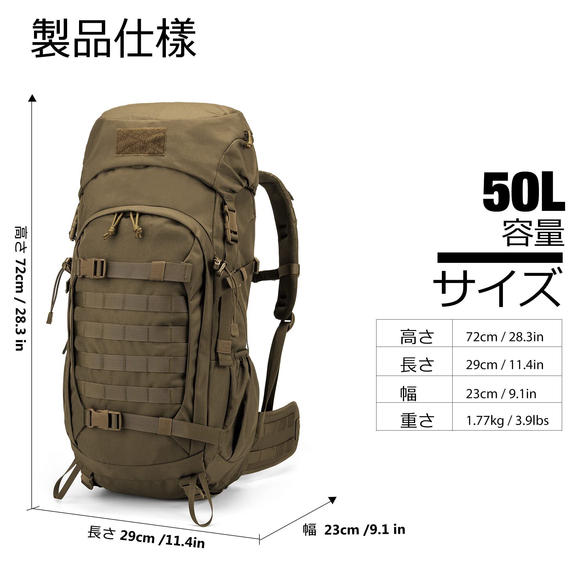 【防水性能】バックパックサイズ:L29xH72xD23cm、容量:50リットル。生地は耐水性のある600Dポリエステル。耐摩耗性に優れ、長時間の使用でも色落ちしません。縫製は耐久性と通気性に優れています。レインカバー付き。