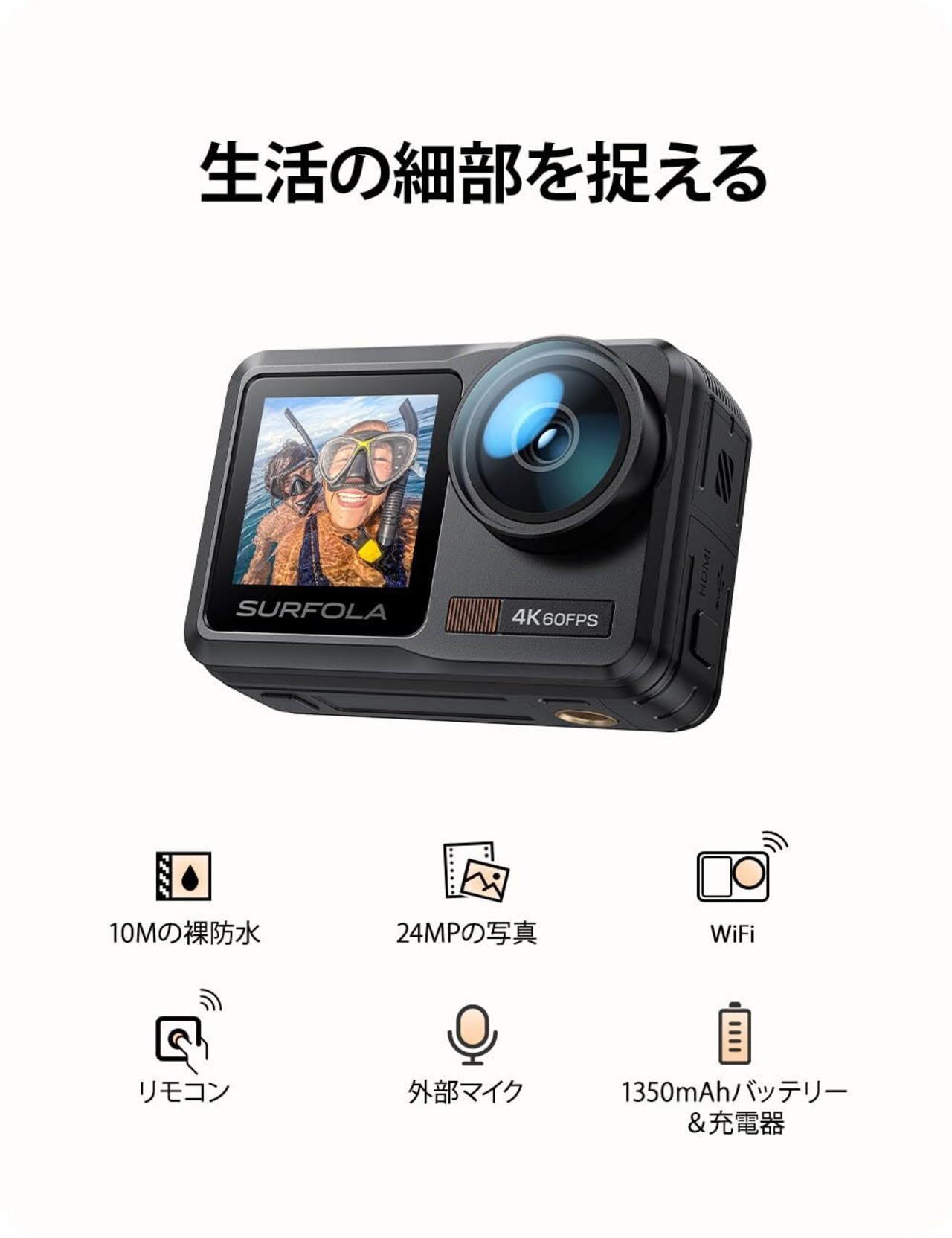 【数量限定】Surfolaアクションカメラ 4K 60FPS 水中カメラ 本機防水カメラ10M WiFi搭載 手ブレ補正 ウェアラブルカメラ 外部マイク付き デュアルカラースクリーンアクションカム 2 x 1350mAh バッテリーおよび充電器付き SF630 | ニコニコSHOP