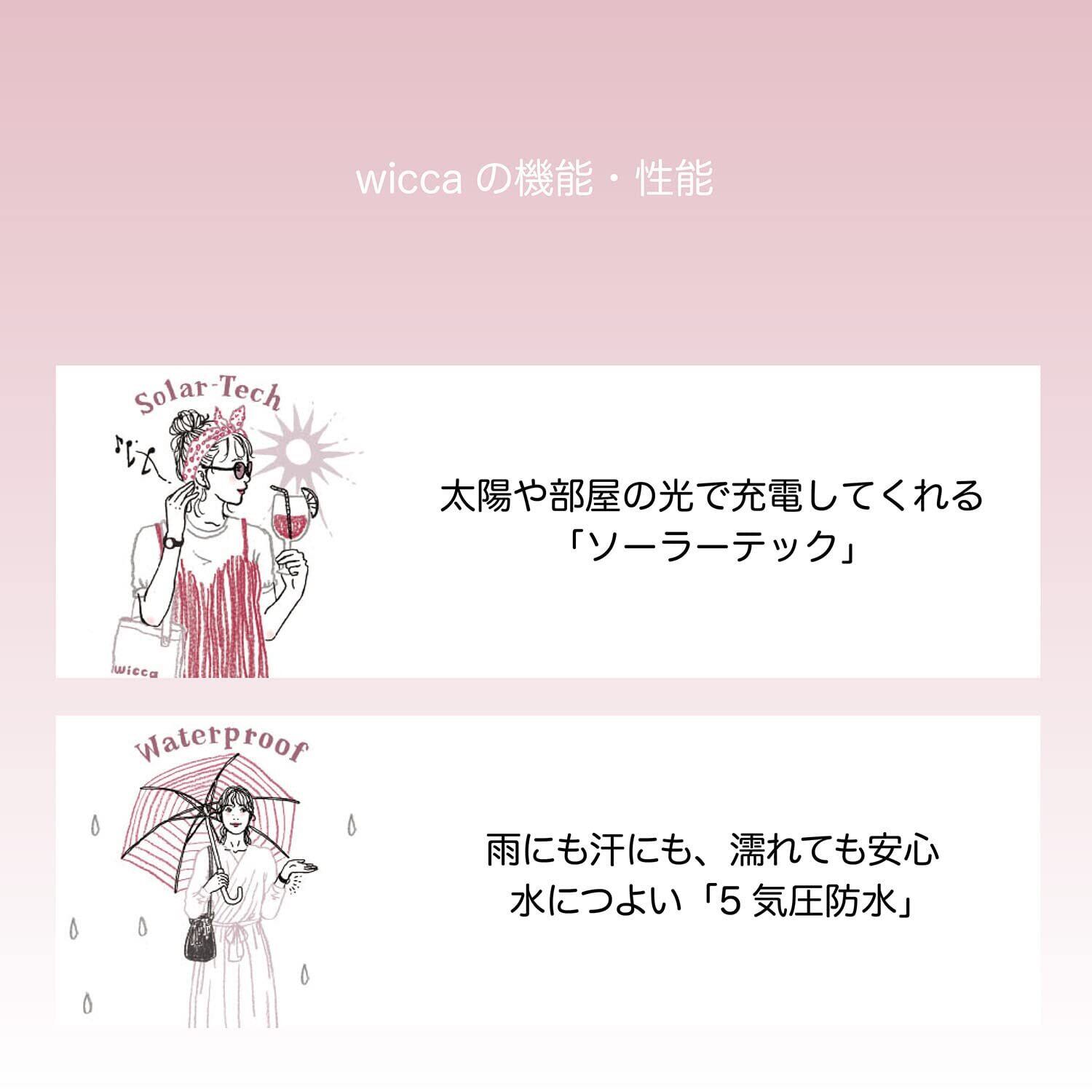【カワイイと機能が詰まったwicca】ときめくデザインに、定期的な電池交換の要らないソーラーテックなど機能性を兼ね備えた時計です。オンでもオフでも貴女の腕元をお洒落に彩ります。