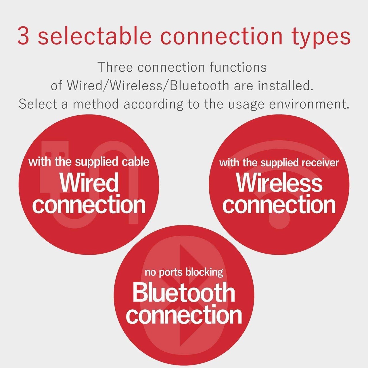 ■有線接続用ケーブルと、ワイヤレスレシーバーが付属し、有線・無線・Bluetooth(R)の3つの接続方法から使用環境に合わせて選択可能です。