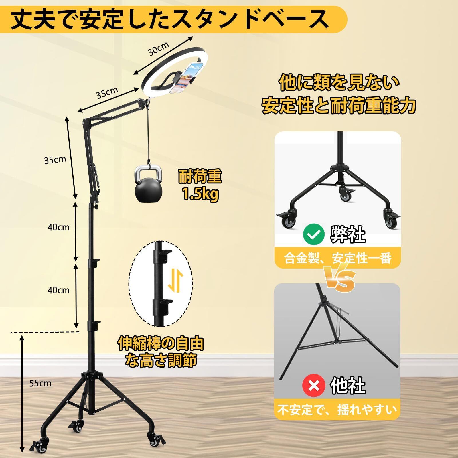 【史上最新キャスター付き俯瞰撮影ライト・全体高さ240cm 】キャスター付き三脚の高さは135cm、アームの長さは70cm。最大240cmまで高さを調整でき、リングライトの傾きも調整できるので、立った状態でも上からライトを照らせます。高品質の合金製で、重さ2.9kgのキャスター付き三脚は、非常に頑丈で耐久性があります。撮影シーンを変更する必要がある場合、移動が簡単で便利です。アーム式リングライト使用時は、好みの撮影角度に簡単に調整でき、上下左右から光が当たるので、顔に影ができにくく、オールラウンドな撮影が手軽に楽しめる。影なしの効果は、料理、絵画、手芸などの手持ち撮影でも特に顕著だ。