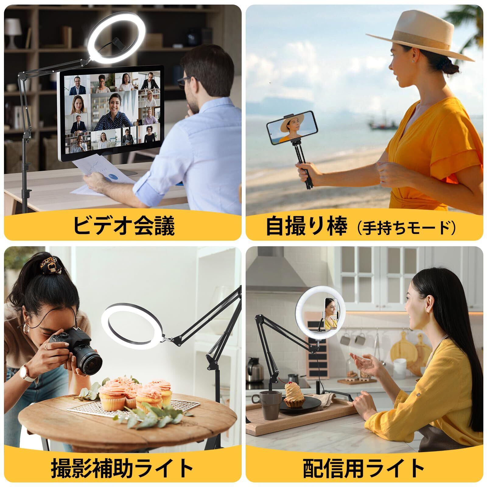 【160電球・3色モード10段階調光 】外径12インチの大きなリングライトには高輝度LEDを160灯搭載し、大きな光を広範囲に当てられるので、顔だけでなく全身を隅々までしっかりきれいに撮影できます。プロフィールの画像やSNS投稿用の画像のクオリティをアップします。また、10段階の明るさ調整機能や3段階の色温度調節機能がついていて、コスパが良い商品です。光の強さと色温度は、さまざまなシーンに合わせてより正確に調整できる。また、オンライン会議などで使用する際、肌をきれいに見せることができ、印象アップにも繋がります。部屋の照明が暗く、顔色が悪く見えてしまう方や、ライブ配信やウェビナーなどできれいに動画を撮りたい方にも必要不可欠な照明器具といえるでしょう。