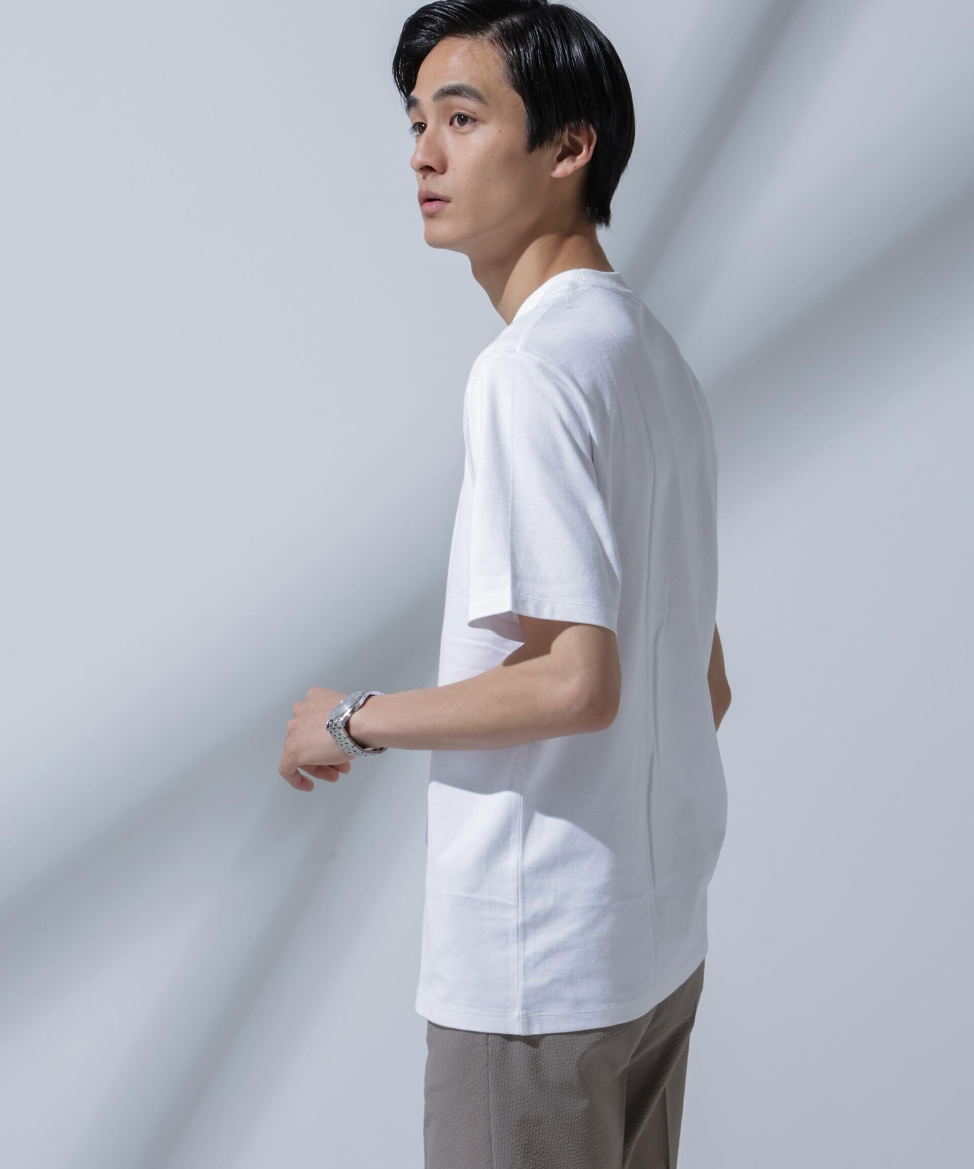 『汗染みを気にせず快適に着用いただける大人気アイテム』毎シーズン、マイナーチェンジでアップデートする人気シリーズ「Anti Soaked」の2024年SS新作クルーネックTシャツ。 生地の表面に特別な加工を施すことで汗染みなどの漏れから生じる生地の変色を目立ちにくくしたアイテム。 通常の天然繊維では味わうことが出来ない合繊繊維のような、機能性と天然繊維ならではの風合いが特徴です。 汗ばむ季節のマイ定番としてワードローブに置いておきたい一着です。