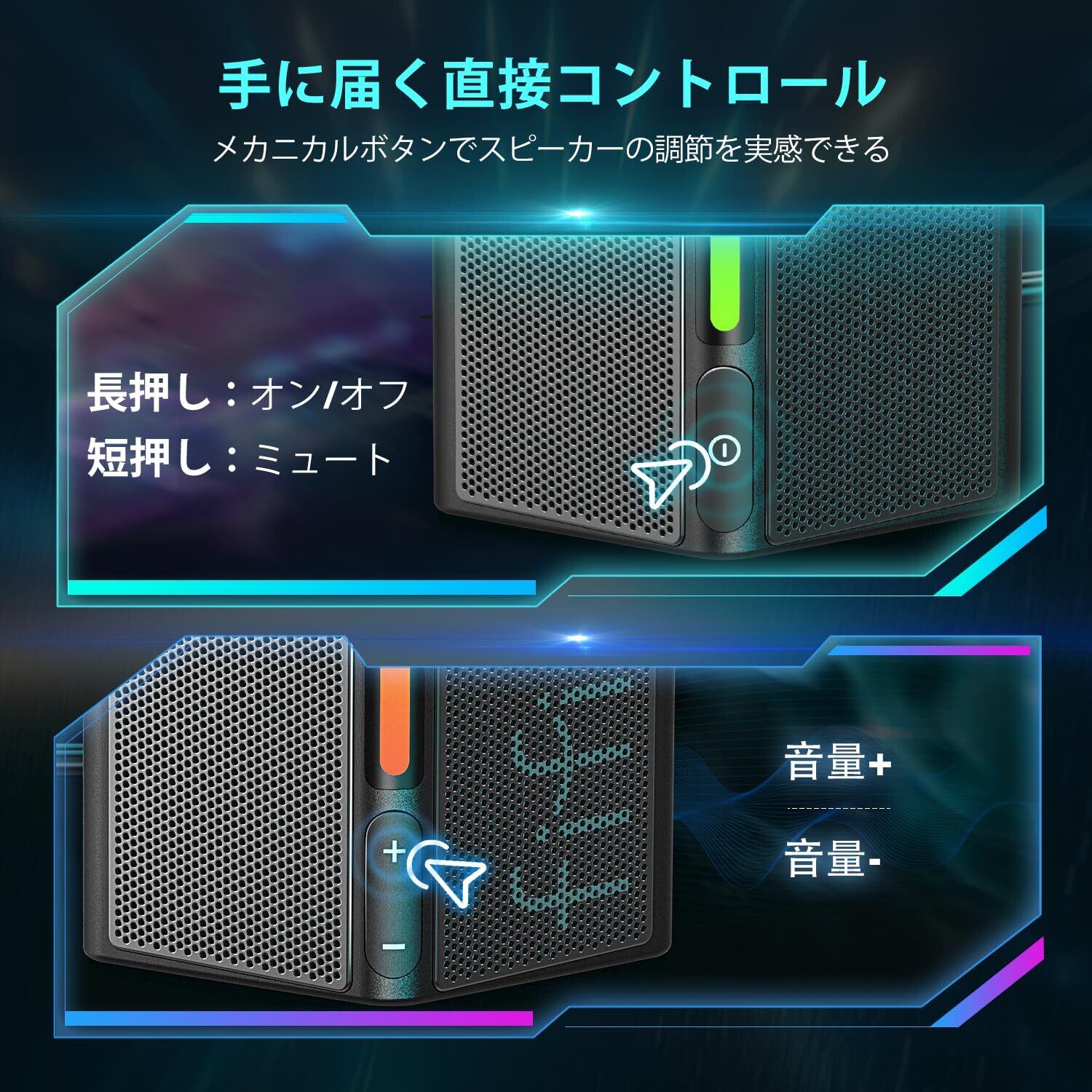 【快適なスイッチコントロール】スピーカー本体にオン/オフスイッチと音量調節ボタンが搭載されています。左スピーカーのスイッチを長押しすると、スピーカーのオン/オフ状態を切り替えます。オンの状態で同じボタンを短押しすると、スピーカーは一瞬でミュートされます。右スピーカーの頂部を軽くタップでRGBモードを変換できます。右スピーカーにある音量ボタンで音量を簡単に調節できます。