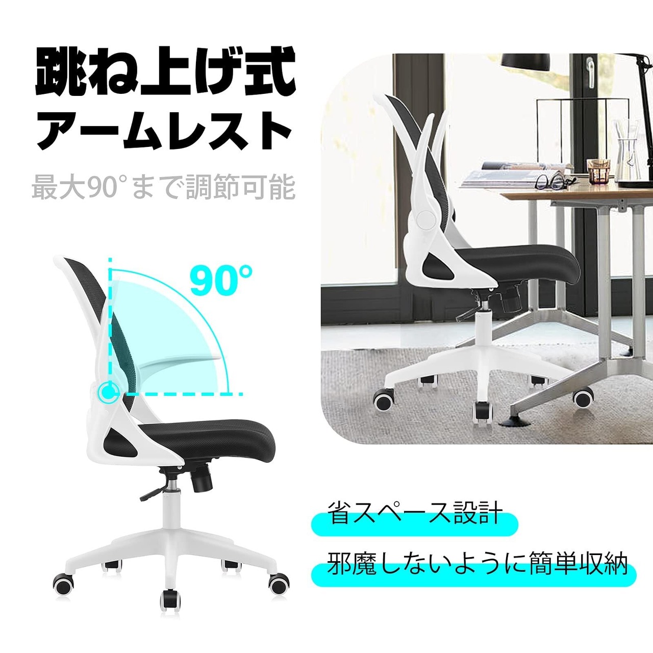 【跳ね上げ式アームレスト】最大90度まで調節できる便利なデザインです。座るときにユーザ次第、アームレストを上げたり下げたりもOK。使わないときにも邪魔しなく更に省スペースでしょう。