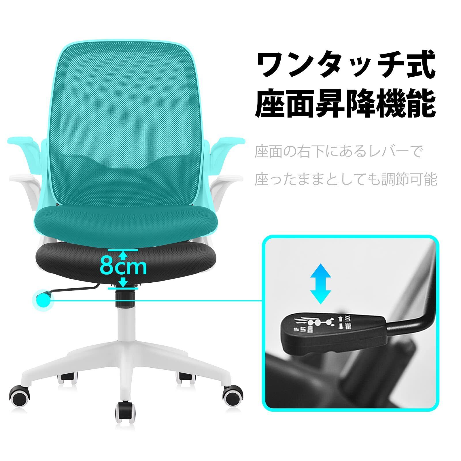 【ワンタッチ式昇降機能】簡単に操作可能です。座面右下のレバーをプルアップすると昇降機能がONになる。色々なシーンに適して、もっと使いやすい環境を作ります。