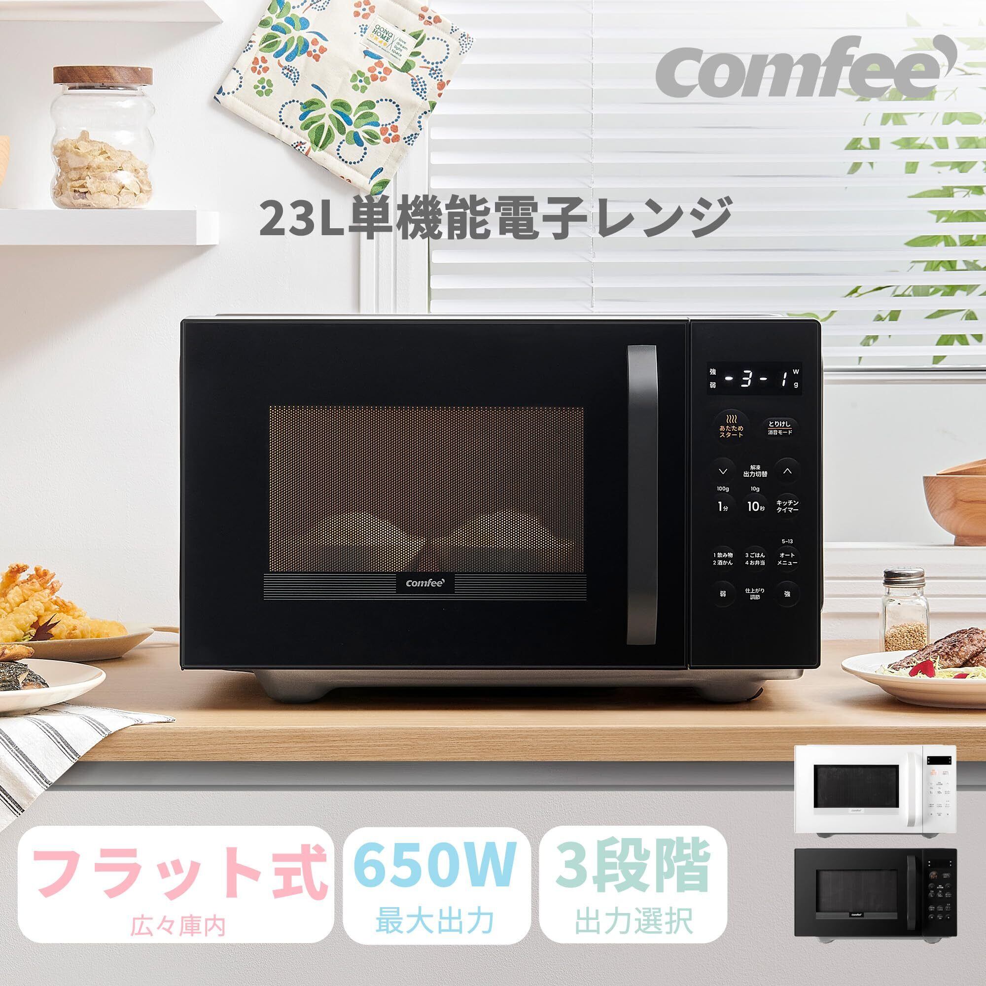 【商品仕様】COMFEE' 23L単機能電子レンジ:◇機能:加熱・解凍・半解凍・消音・チャイルドロック・キッチンタイマー機能付き◇外形寸法:幅496✖奥行400✖高さ303mm、約12.9㎏ ◇庫内寸法:幅306✖奥行347✖高さ204mm◇電源:AC100V、ヘルツフリー ◇出力:200W・500W・650W(65Hzのみ) ◇タイマー:最大89分◇オートメニュー数:13種類※ 製品保証期間:一年間