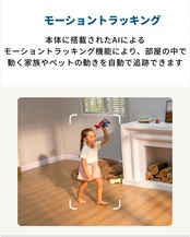 モーショントラッキング:本体に搭載されたAIによるモーショントラッキング機能により、部屋の中で動く家族やペットの動きを自動で追跡できます。