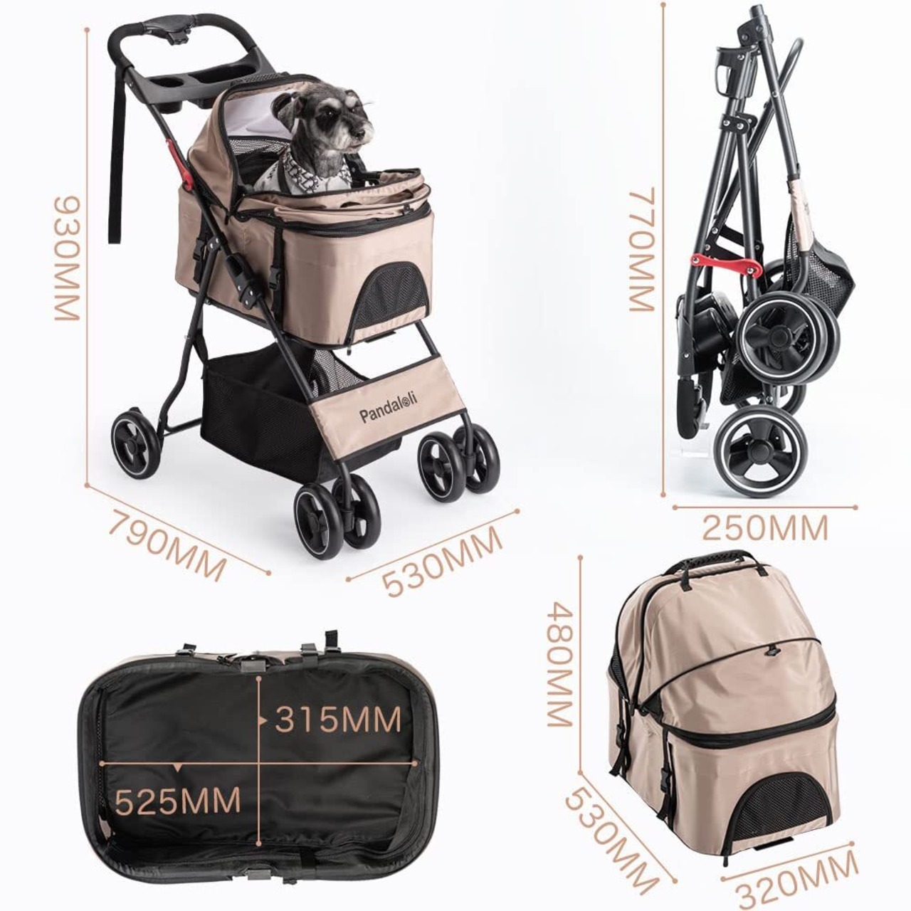 Pandaloli ペットカート ベビーカー 犬 バギー:小型犬 中型犬 猫 多頭 カート 4輪 軽量コンパクト 飛び出し防止リード2本付き 前輪360°回転 後輪ブレーキ付き 折りたたみ 組み立て簡単 耐荷重20Kg ベージュ色