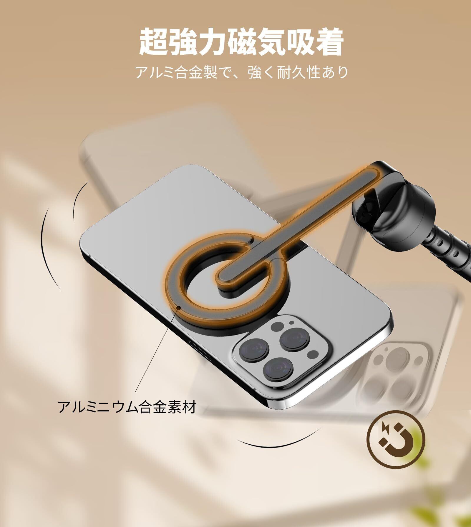 Magnetic スマホ三脚:自撮り棒 三脚は磁気吸着設計を採用しており、クリップを使わずに磁気対応(iPhone 12/13/14/15/16シリーズ)のスマホを簡単に固定できます。強力な磁力により、スマホがしっかりと吸着し、落下の心配も少なくなります。磁気非対応のスマホには、付属のメタルリングをスマホの背面に貼り付けるだけです。磁気式スマホ固定リングの最大耐荷重は500gで、より重いデバイスにも対応可能。