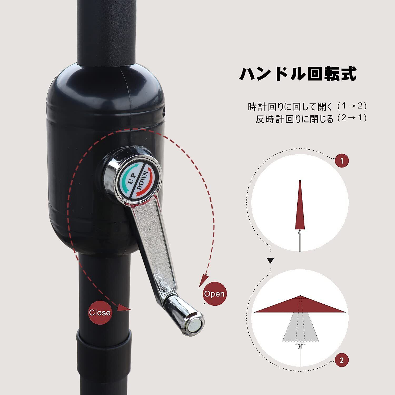 使用簡単:アルミ製の支柱は木製パラソルと比べると軽くて、力に自信のない方でも比較的楽に持ち運びや設置することができます。パラソルの開閉には、普通の傘とは違いハンドル式を採用、クルクルと回すだけで開閉できるので、これほど大きなパラソルでも女性一人で簡単に開閉できます。