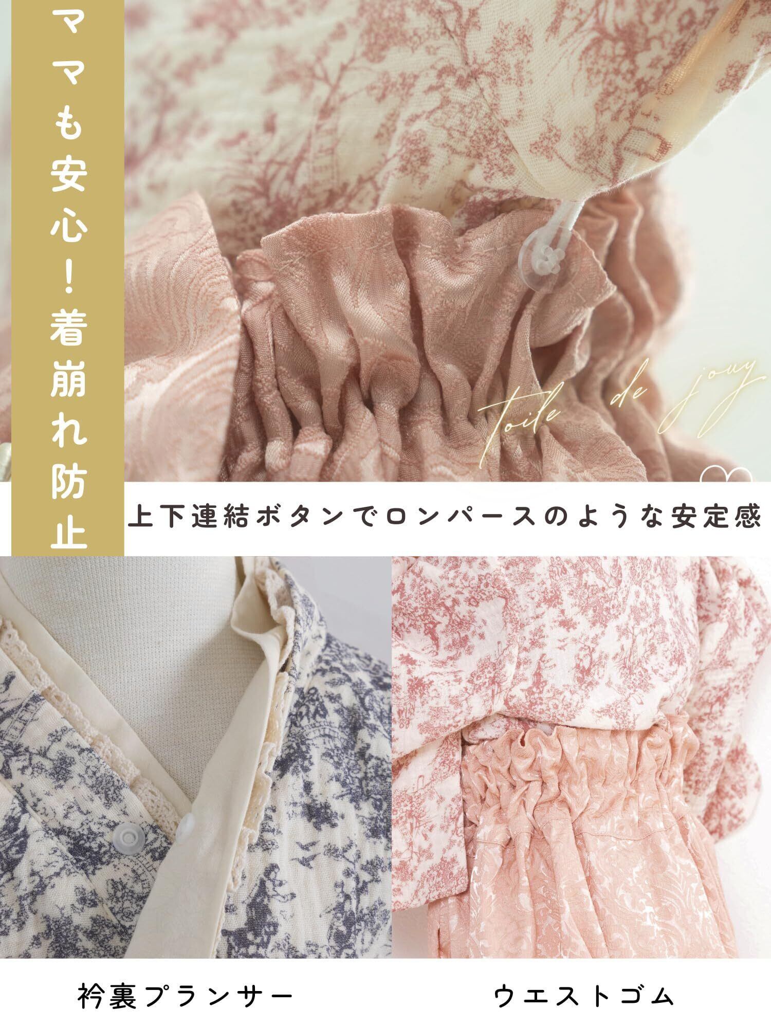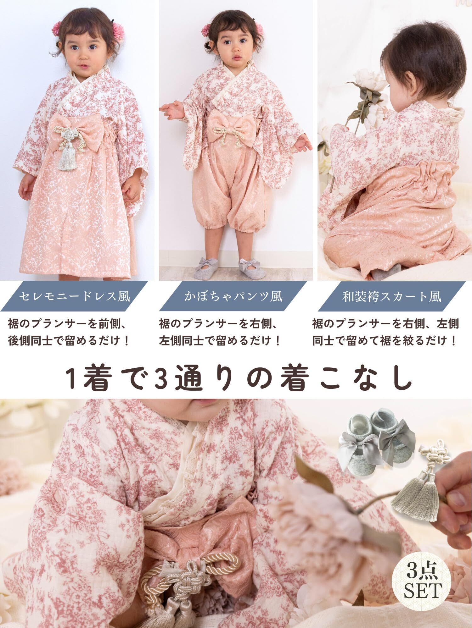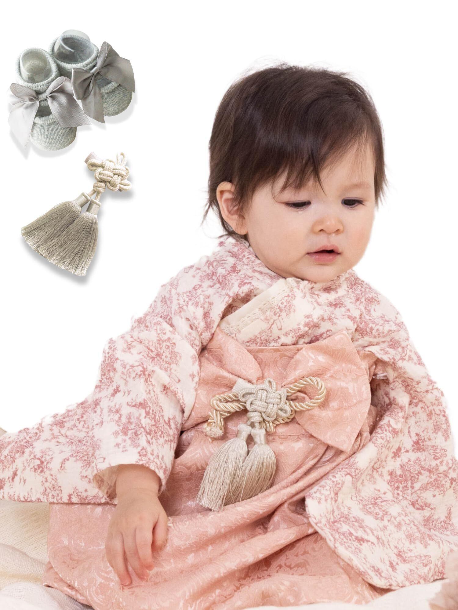 【トワルドジュイ柄ガーゼ素材】ドレスのような美しい2ピース袴&ベビー靴下(9-12㎝)&タッセルクリップの豪華3点セット!!ドレス風、袴風、かぼちゃパンツ風の3WAY