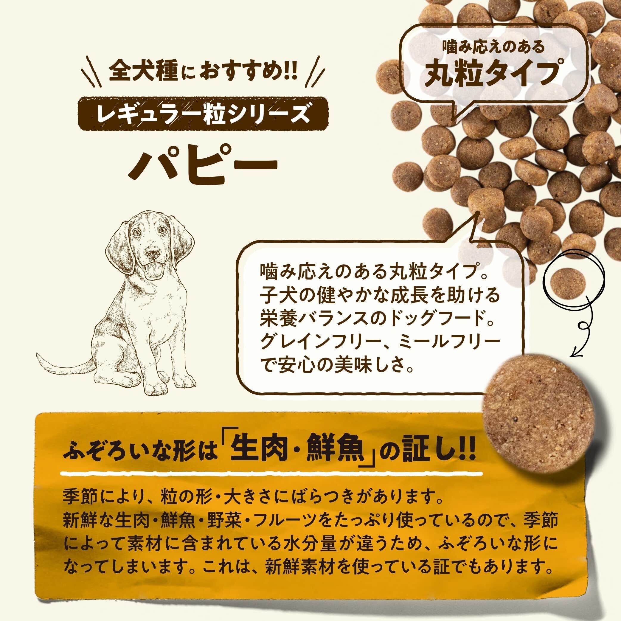 【子犬用・レギュラー粒タイプ】食べやすい丸形のレギュラー粒タイプです。新鮮素材を使用しているため、季節によって粒の形・大きさにばらつきがあります。