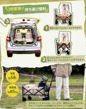 【58Lキャリーワゴン/本体・底板一体型】キャンプなどアウトドアで便利に使えるミドルサイズのキャリーワゴン。それでも積載約58Lの容量です。一度にたくさんの荷物を持ち運べます。組み立ては、折りたたみ式でフレームを展開するだけ。本体と底板が一体型なので、底板を敷く必要がない簡単な組み立てです。