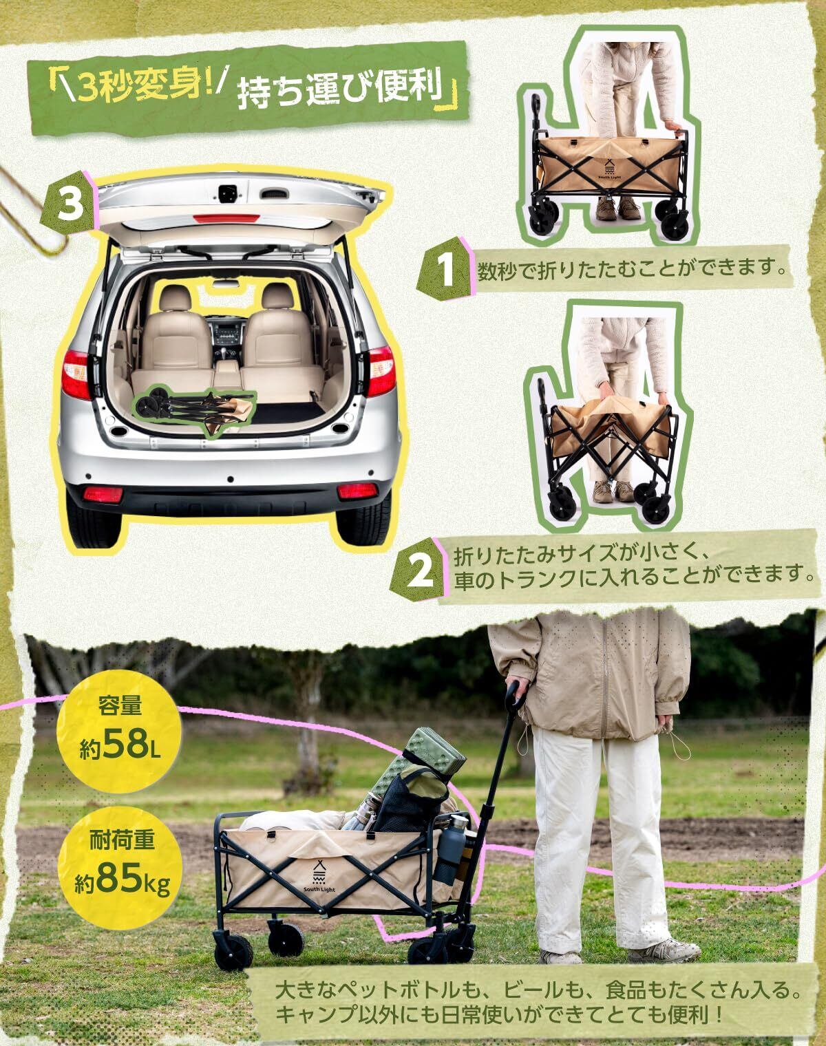 【数量限定】【hidemasa】キャリーワゴン ミニ キャンプカート 折りたたみ 【容量58L・コンパクト収納】 軽量 持ち運び便利 収納ポケット付き 大容量 キャンプ ワゴン 運動会 ビーチ 釣り BBQ レジャー キャンプ用品 荷物運び 引っ越し 買い物 カート キャリー(カーキ) | ニコニコSHOP