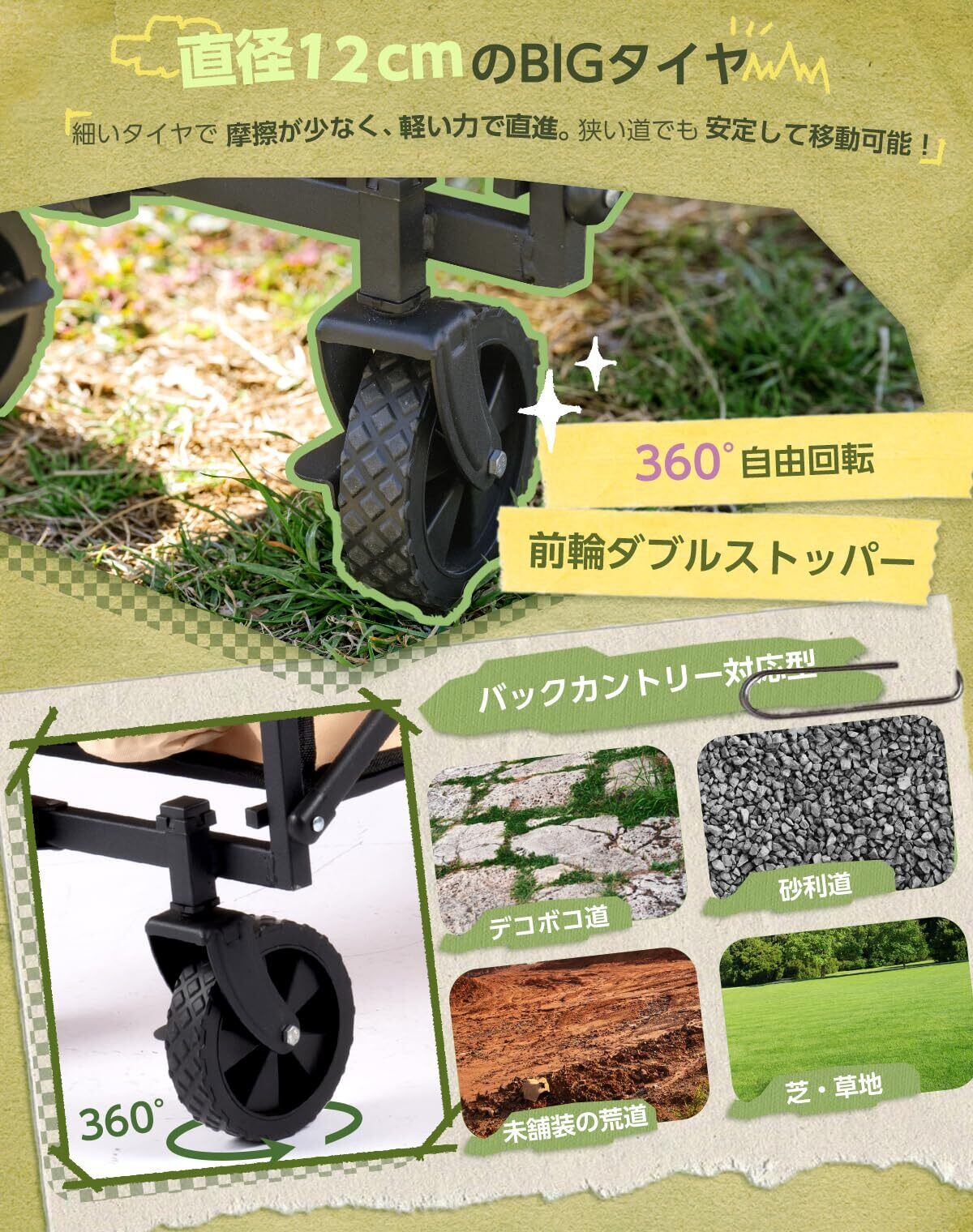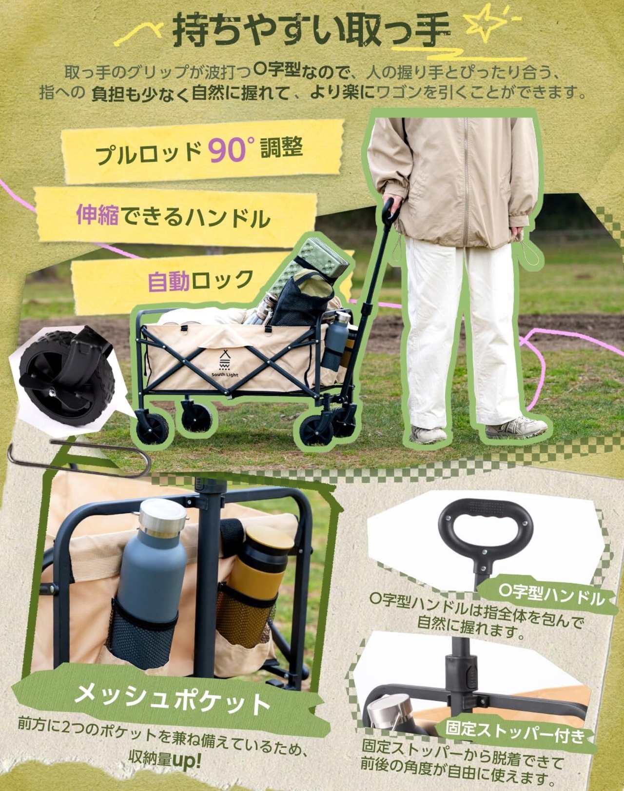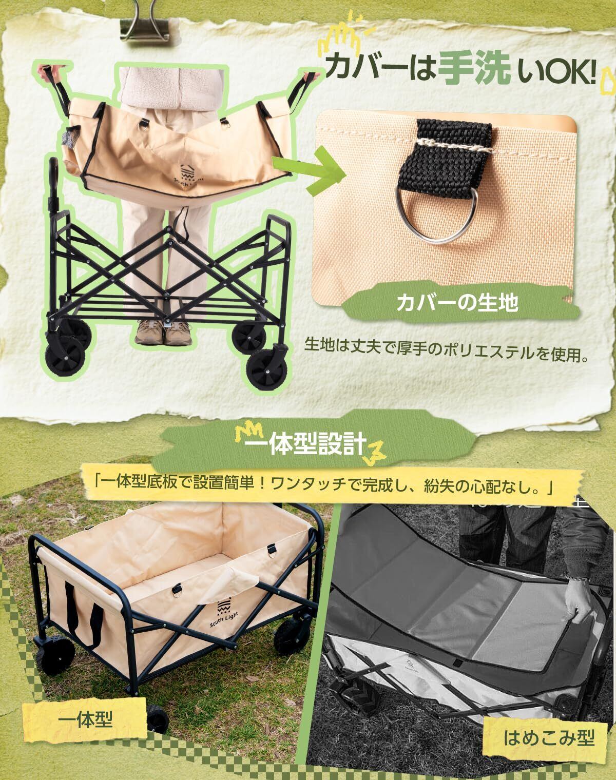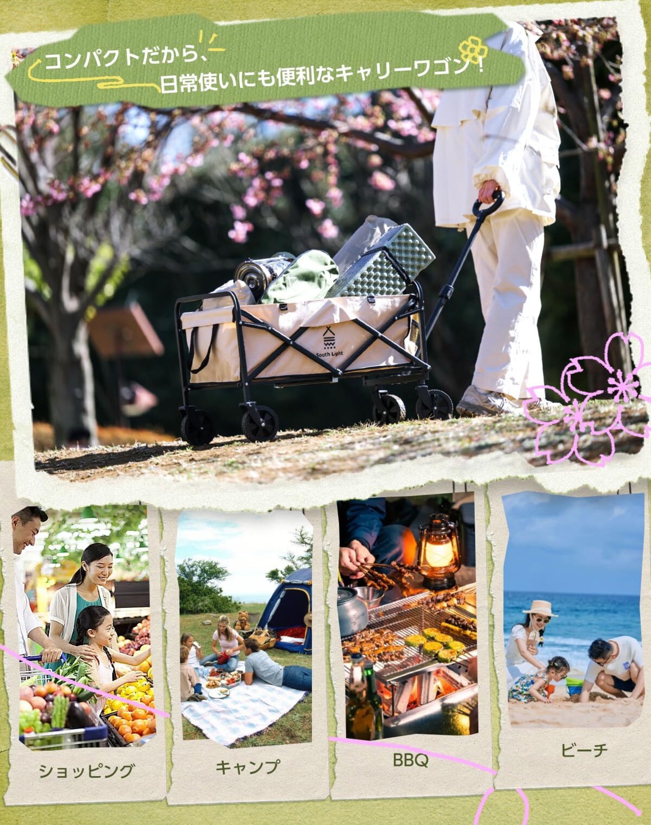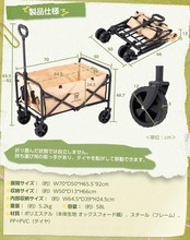 【仕様】 製品名:アウトドア キャリーワゴン 型番:sl-lc120-kk 材質:ポリエステル(オックスフォード織りシート)、スチール(フレーム)、PP+PVC(タイヤ) サイズ:使用時 約W70×D50×H65.5~92cm 収納時 約W50×D13×H66cm カラー:ベージュ。 重量:約5.2kg 容量:約58L 同梱品:本体×1、取扱説明書×1