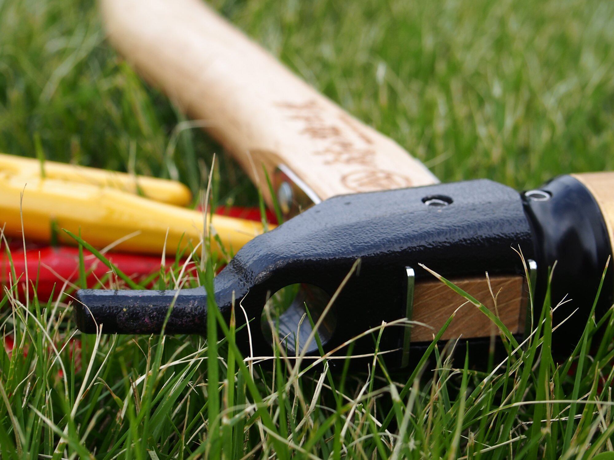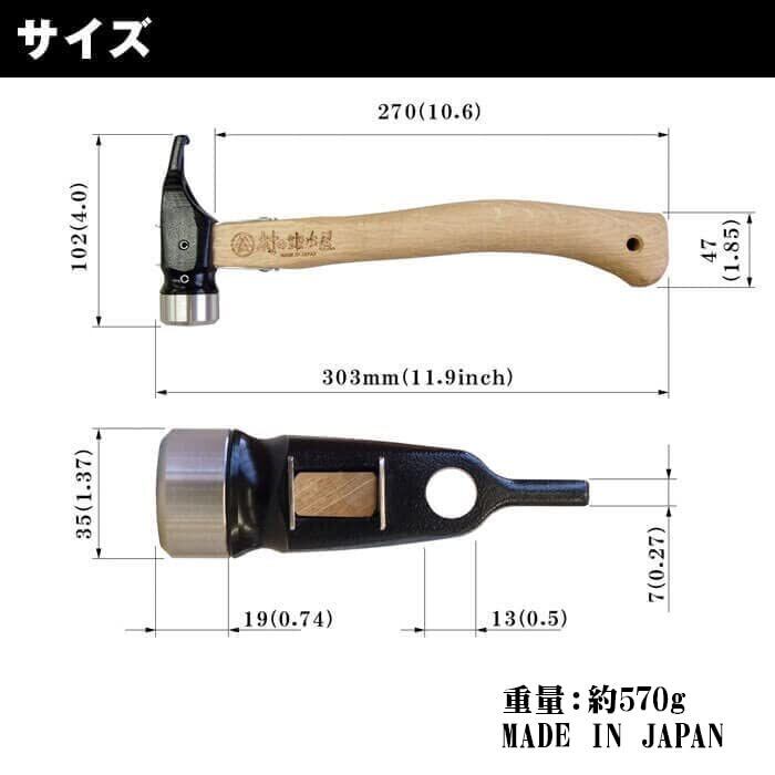 ヘッドは真鍮製で、「黄銅」とも呼ばれる、銅Cuと亜鉛Znの合金です。適度に強度があり、時間経過と共に次第に黒ずみ、その変化を愉しむ事もあります。この黒ずみは酸化皮膜ですので防錆効果も期待できます。木柄は天然木、流れるような曲線を木柄に用いています。