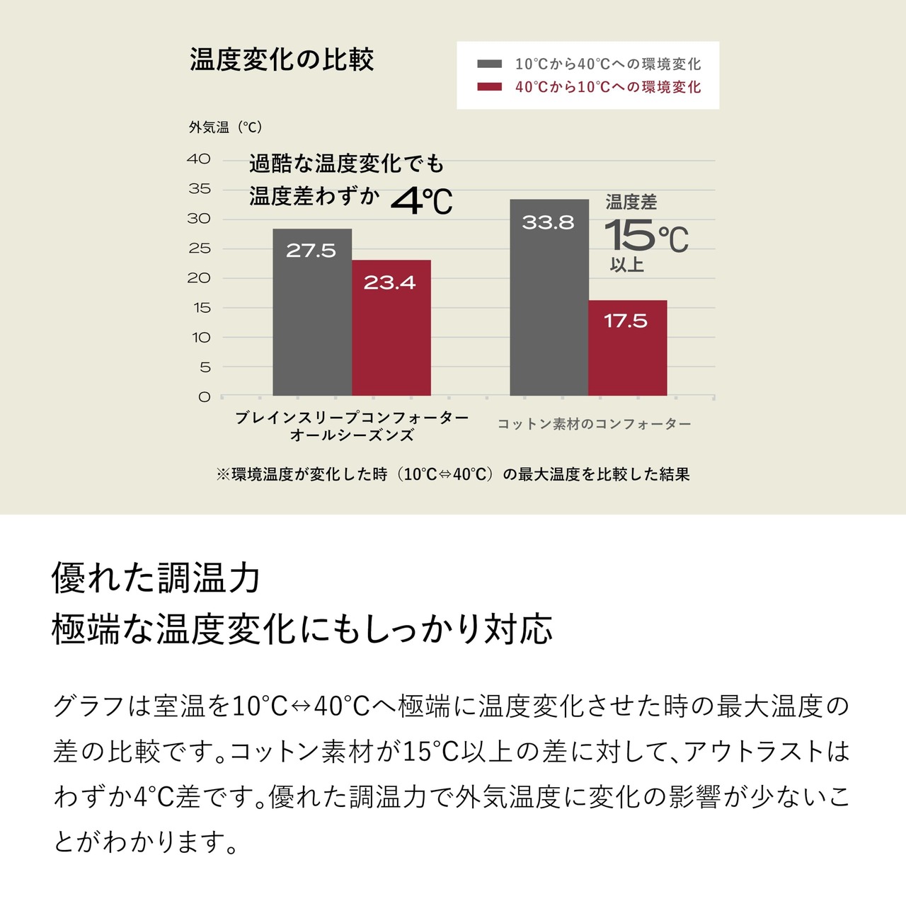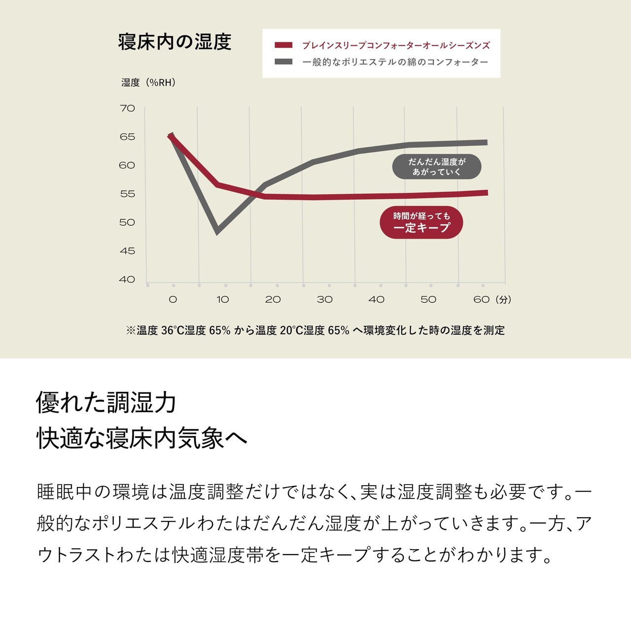 宇宙服のために開発された素材「アウトラスト」が理想の寝床内温度帯へ導く。「アウトラスト」は直径20~30ミクロのマイクロカプセルが繊維の中に組み込まれた温度調整素材。