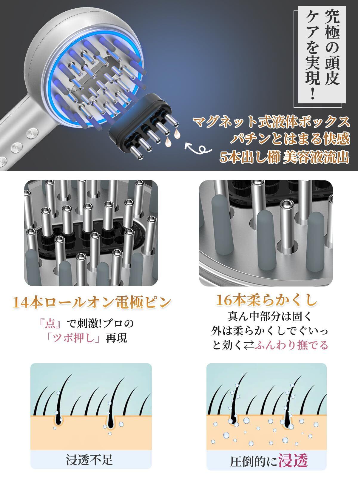 【究極の頭皮ケアを実現!】中央の5本出し櫛は、ケアしながら美容液などの流しは可能で、電極ピンとの組み合わせで、高級な美容液が無駄なく頭皮に浸透させ!鍼灸師監修のもと 、14本のEMS電針が筋肉にアプローチし、『点』で刺激!16本のシリコンピンが「和みタッチ」を!液体ボックスはマグネット式で簡単着脱&丸洗い可能で衛生的。