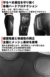 ●ハードプラスチックガードを尾骨・大腿部に配置し、膝にはCE規格のプロテクターを配置したプロフェッショナルモデル。 ●下半身を強力に保護します。 ●ストレッチ性の高い素材を使用しているため、運動性能を妨げることはなく、素材が薄いためパンツの下に履いても気になりません。 ●ボトムは足裏に引っ掛けるループ式になっているため装着後のズレも低減しています。