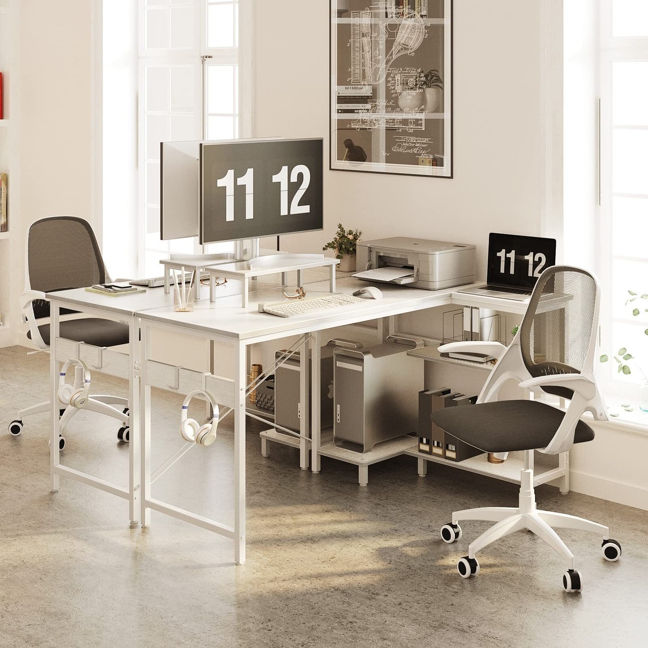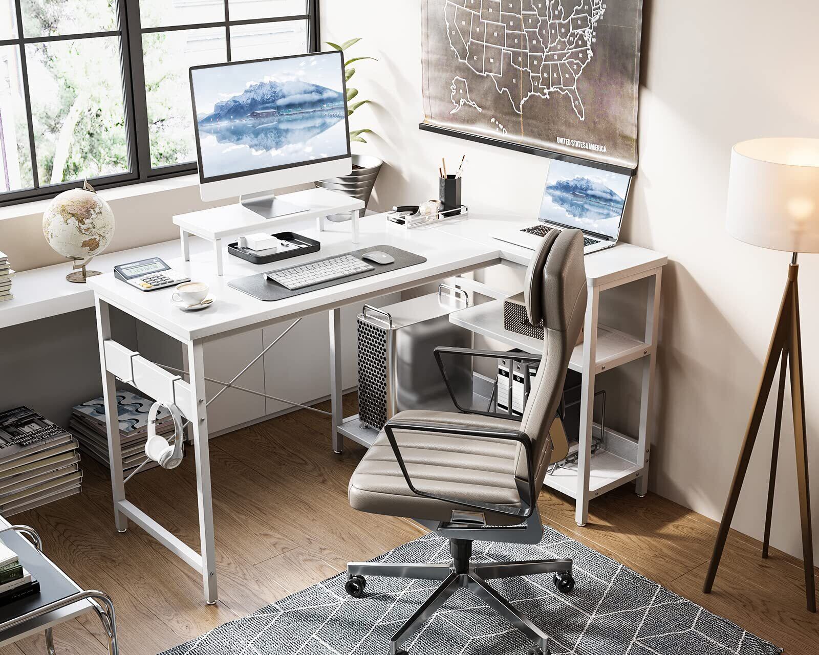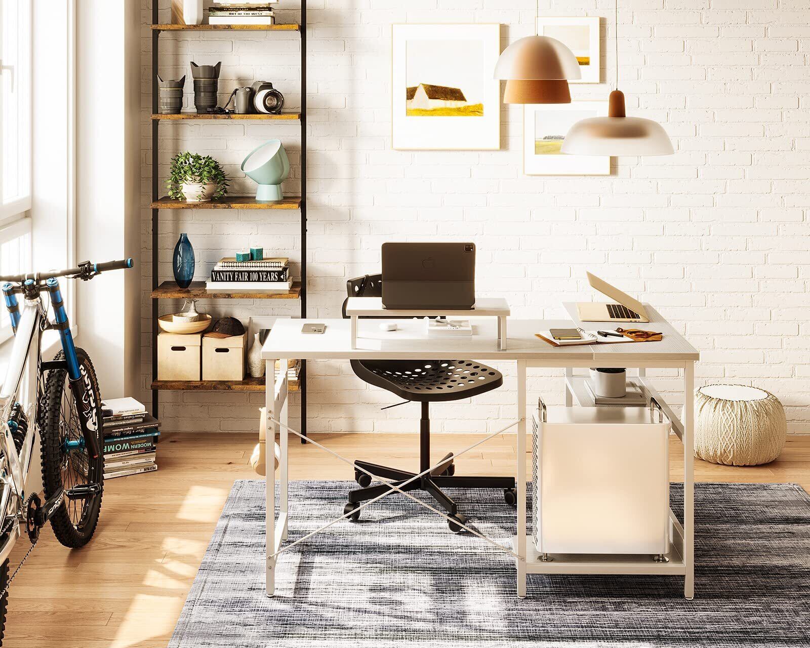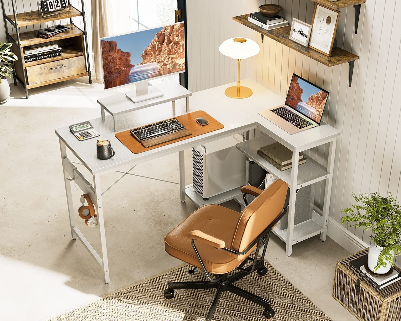 【ラック付きデスク】デスクの足元には一体型のラックが備え、本や書類などを使いたい時にサッと取り出せます。たっぷりの収納でデスク周りをスッキリ快適に!また、L字型のデザインで部屋のコーナーを最大限に活用でき、ご家庭でもオフィスでも、日常の操作に十分なスペースを確保できます。