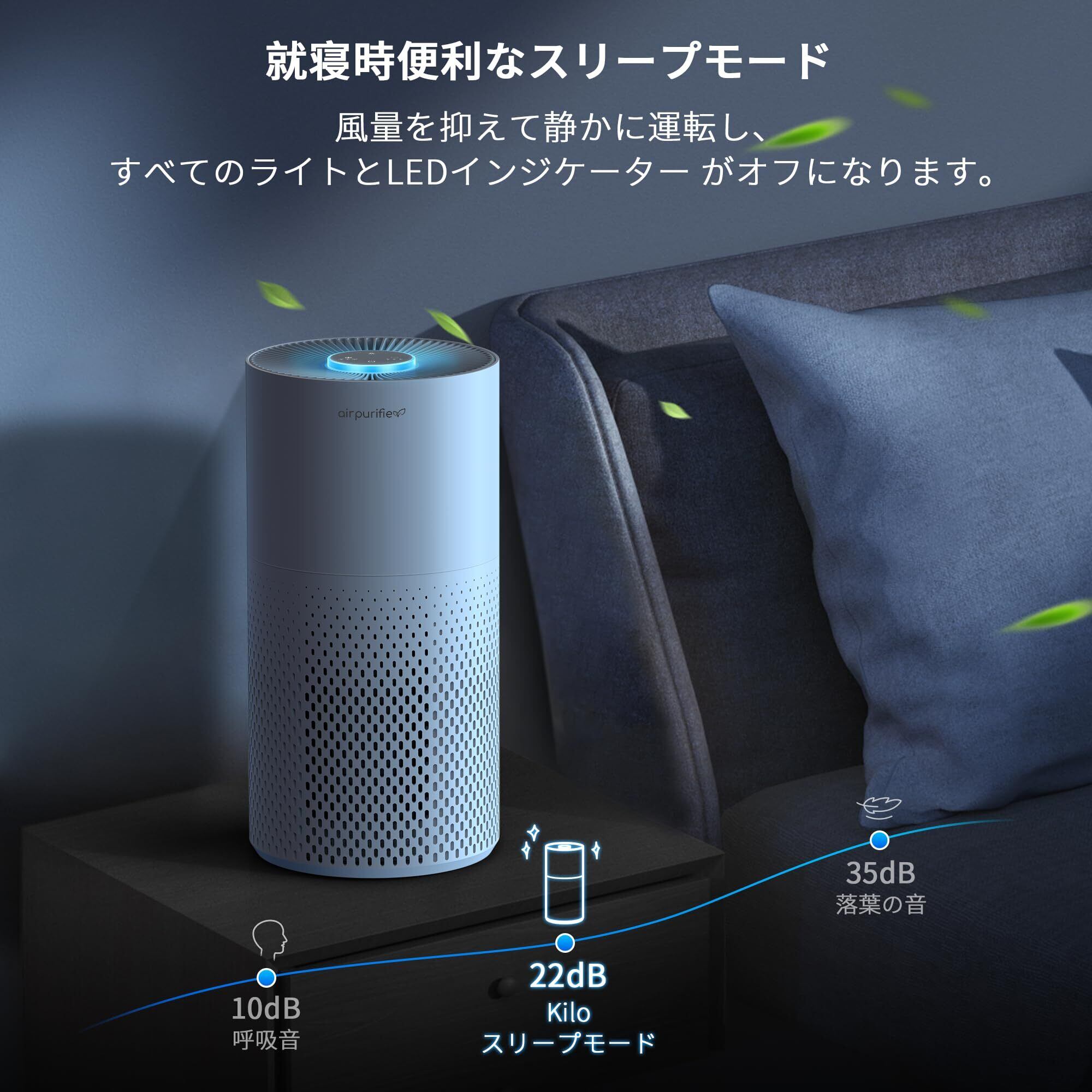【スリープモード・お手入れ簡単】就就寝時にスリープモードに切り替えると、すべてのライトとLEDインジケーター がオフになり、安眠を妨げません。更に、静音性に優れており、赤ちゃんやお年寄りがいる家庭にもおすすめ します。洗えるフィルターというものがありますが、洗ってしまうと目詰まりや繊維が変形し新品時の性能を持 続することが困難です。本製品はフィルター交換式で、丸ごと交換可能でお手入れも簡単です