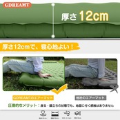 【寝心地よいのダブルエアーマット】超厚手のダブルエアーマットが発売!❶GDREAMTのエアーマットの厚さは12cmで、使用時に地面のゴツゴツ感が体に伝わらず、底つき感もなく、地面からの暑気や寒気もシャットアウトでき、寝心地がいい。寝心地よいを目指している人にはおすすめダブルエアーマット!❷ダブル エアーマット内部には肝心なサポートベルト設計により、体の沈み込みに防ぎ全体の体重をバランスよく支えてくれ、形崩れしにくく、沈み込むこともありません。横向き、仰向け、うつぶせなど、どんな姿勢でもぐっすり眠ることができます。(※座る・膝立ちの状態でも、地面に付く感触はありません。)