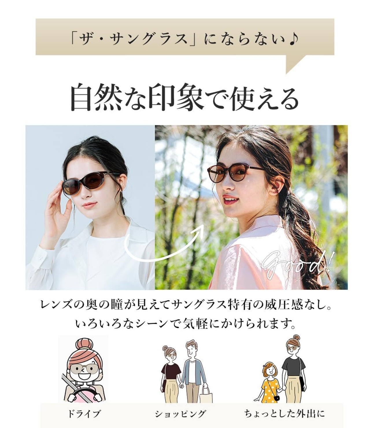 うすいレンズはUV対策に最適:一般的なサングラスよりもうすいレンズカラーでもUV99%カット。レンズの奥の目が見えて、サングラス特有の威圧感がありません。