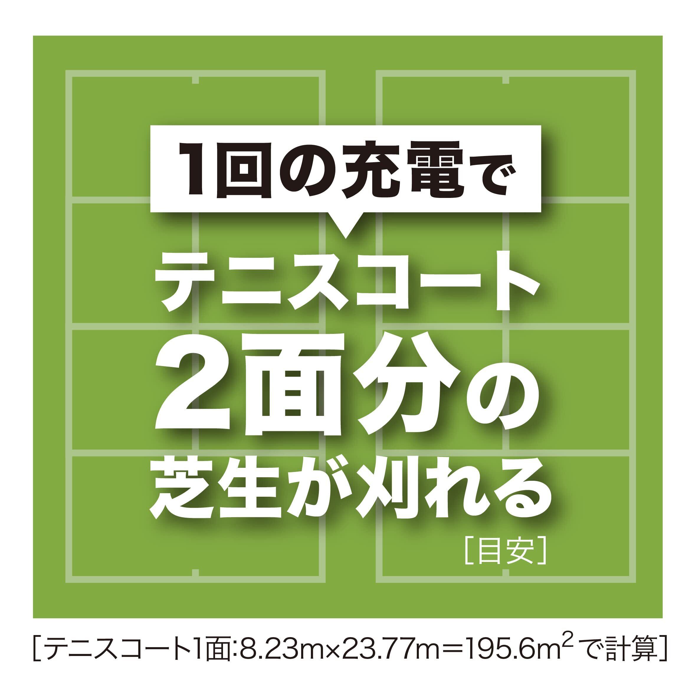 テニスコート2面分の芝生が刈れる(目安)。1回の充電で120坪(410m2)の芝刈りに対応。※BL1860B使用時。バッテリの充電状態や作業条件により異なります。