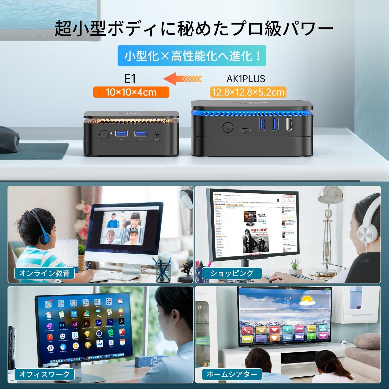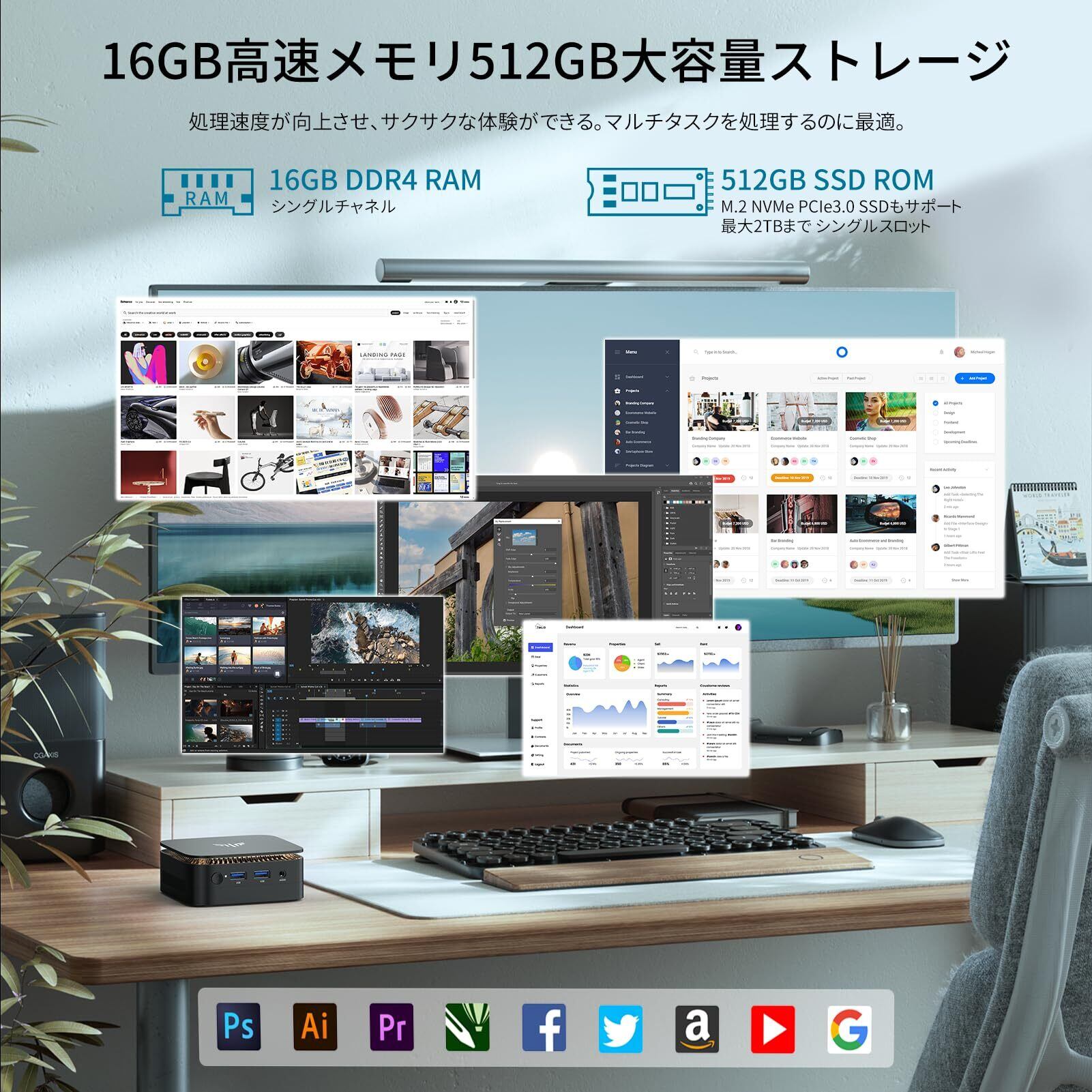 2.【2025新型ミニPC→さらに小さくて軽い、さらにパワフルで静か】:小型pcはメモリ/ストレージが16GB+512GBを標準搭載しています。SSDの接続端子はM.2 NVMe PCle3.0 SSD/SATA SSD対応し、最大2TBまで換装可能です。DDR4高週波メモリは、システム全体の応答性を高め、非常に速く、ラグやジャンプがありません。2025新型省スペースミニPCとして、他社製品に比べて、体積60%削減(驚きの10×10×4cmに小型化進化)、超軽量274g(他社製品より30%軽量化)を実現しながら、処理性能は15%向上。●超静音冷却ファンを内蔵し、放熱が速く、騒音が少ないなどの特徴を持っています。高回転扇葉は熱を早く発散させ、熱による引き起こされるフリーズ、シャットダウン、ブルースクリーンなどの問題が前世代より大幅に削減し、PCの安定した動作を保証します。