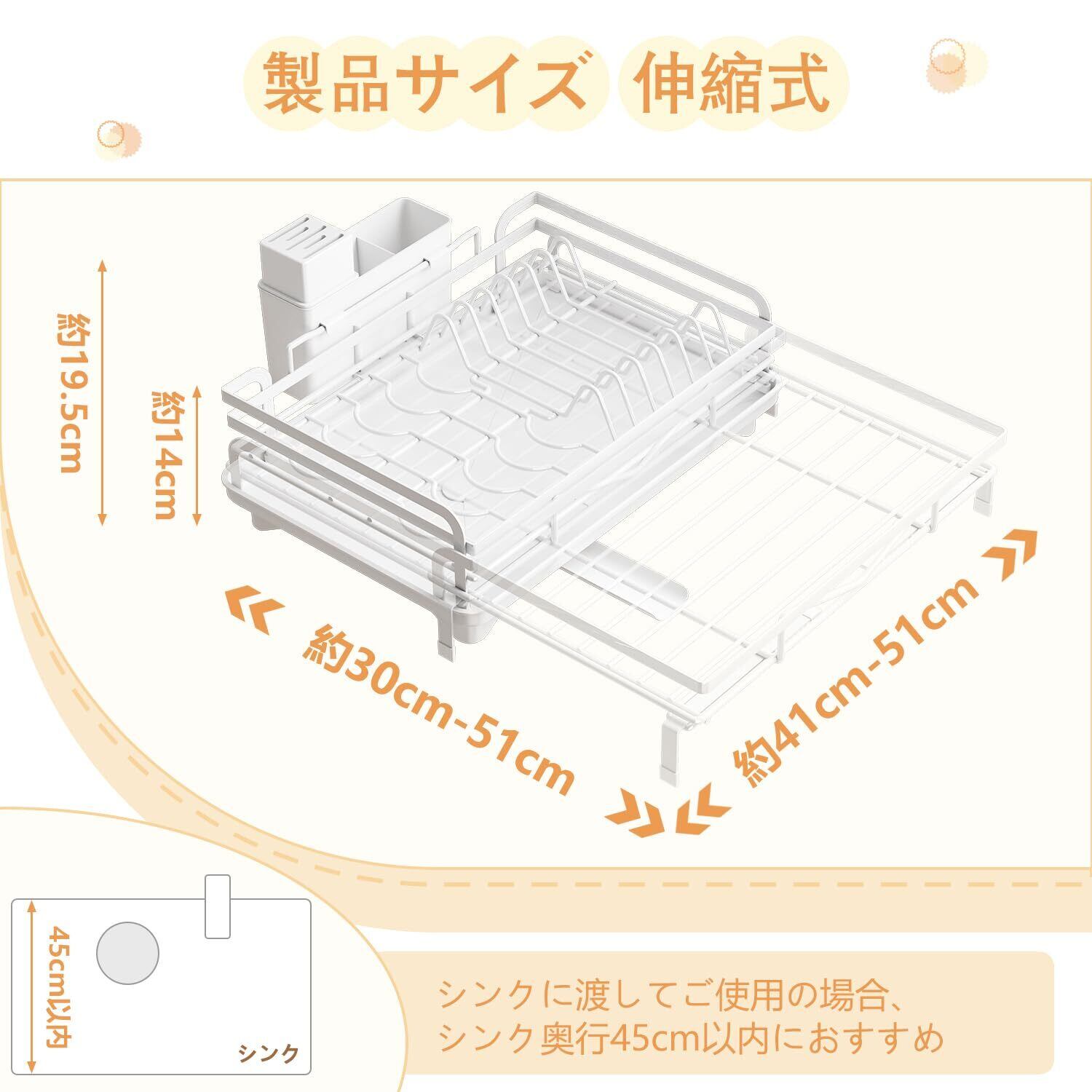 【伸縮式水切りラック&サポート脚 】この食器ラックは伸縮式でサイズが調整可能で、食器の量に応じて伸縮自在です。省スペースモードは最小幅が約30cmです。大容量モードは最大幅が約51cmです。また、伸縮式サポート脚が付き、約41~51cmまで伸縮可能で、異なるシンクカウンターに対応できます。水切りカゴの脚部には保護カバーが付き、伸張時にキッチンカウンターを傷つけませんし、安定性も高めています。シンクに渡してご使用の場合、シンク奥行45cm以内におすすめです。