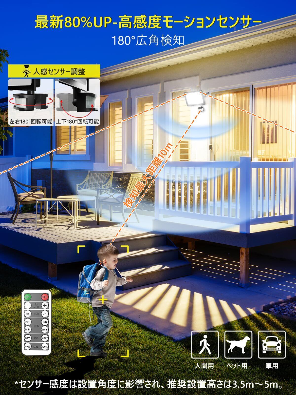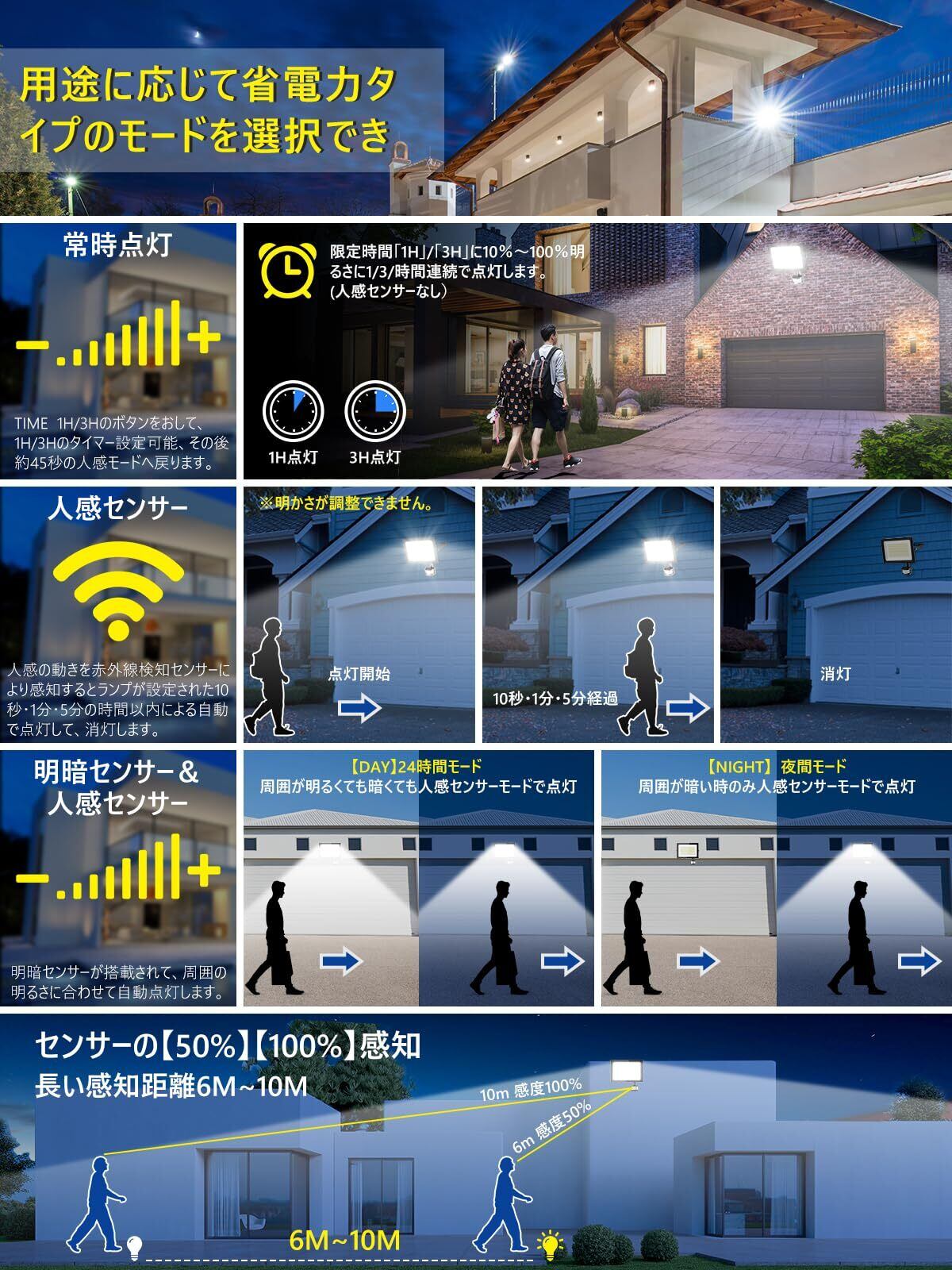 【最新改良センサーライト・製品の仕様】お客様の要望をもとに機能全面改良をを行い、リモコン操作を追加しました。 人感センサーライト:100V/150W サイズ:22.5*15.5*3cm 操作方法:リモコン操作 ランプボディ角度調整: 360°上下調整可能 センサー感知角度調整: 180°上下左右調整可能 発光色:10段階調光可能 LEDライト輝度:約20000LM 照明角度:最大120°広角 センサー感知範囲:180° 設置場所:屋外 点灯時間:1H/3H常時点灯 点灯モード:4つの知能モード 演色指数(Ra)>85Ra 用途: 一般家庭・駐車場・玄関などの節電照明・防犯に最適!! ご注意ください *初めて電源を入れて使用するとランプが自動的に点灯します。 そうなければリモコンONボタンを押すと点灯します。 *【1H】/【3H】/【PIR】の3つのボタンを押すと、ランプは正常に2回点滅します。