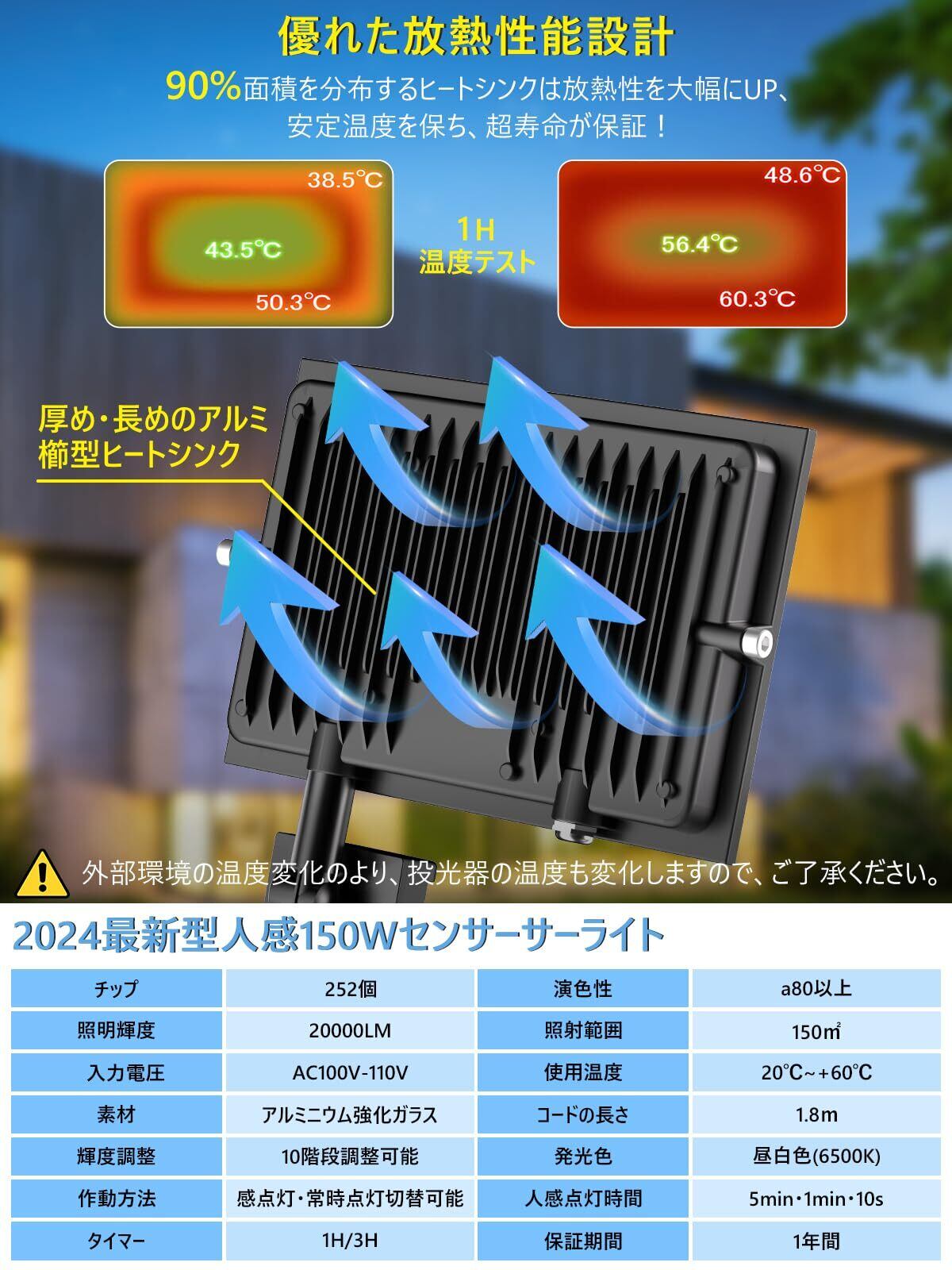 KIWEN センサーライト 投光器 LED センサーライト 超爆光 100v 150W 昼光色 6500K 20000LM 120°広角照明 10階段調光可能 感知式 人感 センサーライト 屋外 コンセント IP66防水 防塵機能 屋外用 led 投光器 防犯センサーライト/リモコン操作/常時明暗点灯機能/検知距離を調整可能 2プラグ 防犯灯 カーポート 廊下 駐車場 玄関 倉庫