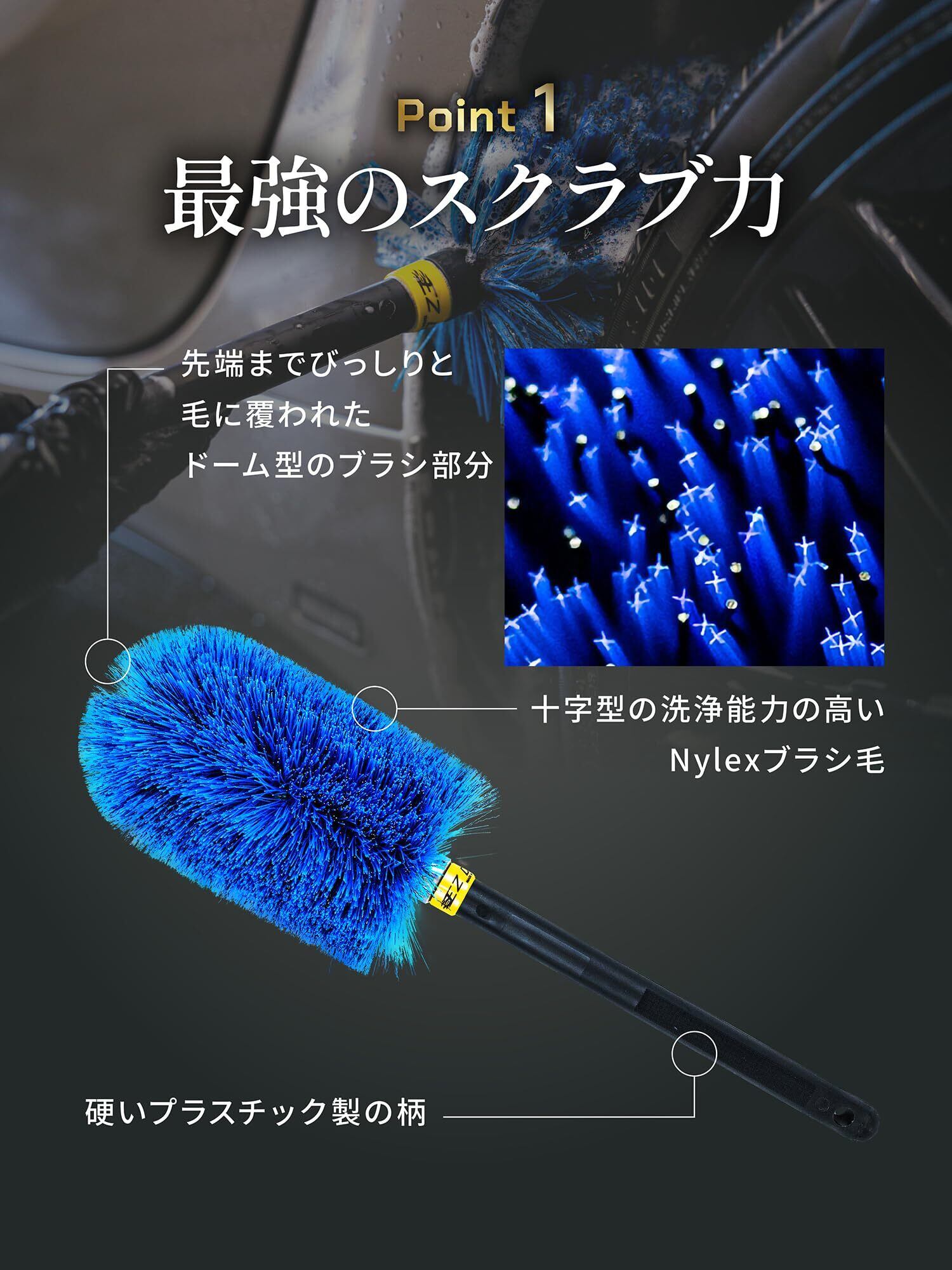 【ブラシ毛】EZディテールブラシは、頑固なブレーキダストを取り除くのに十分な剛性を持ちながら、ホイールの表面を傷つけない柔らかさも兼ね備えています。また、耐薬品性があるので、あらゆるクリーナーで使用ができます。そして、形状記憶効果のあるNylex素材を使用しているため、使うたびにブラシ毛は元の形状に戻ります。