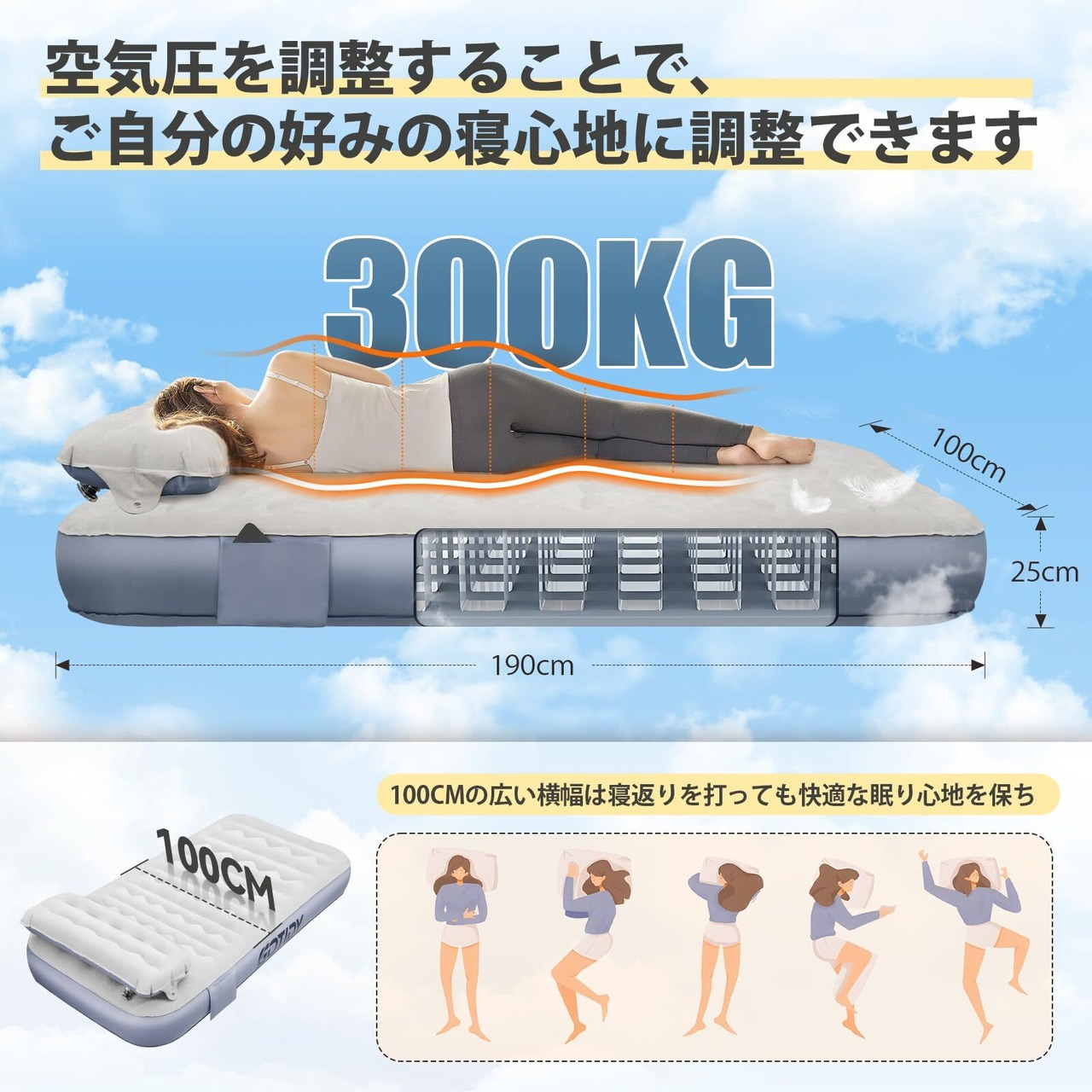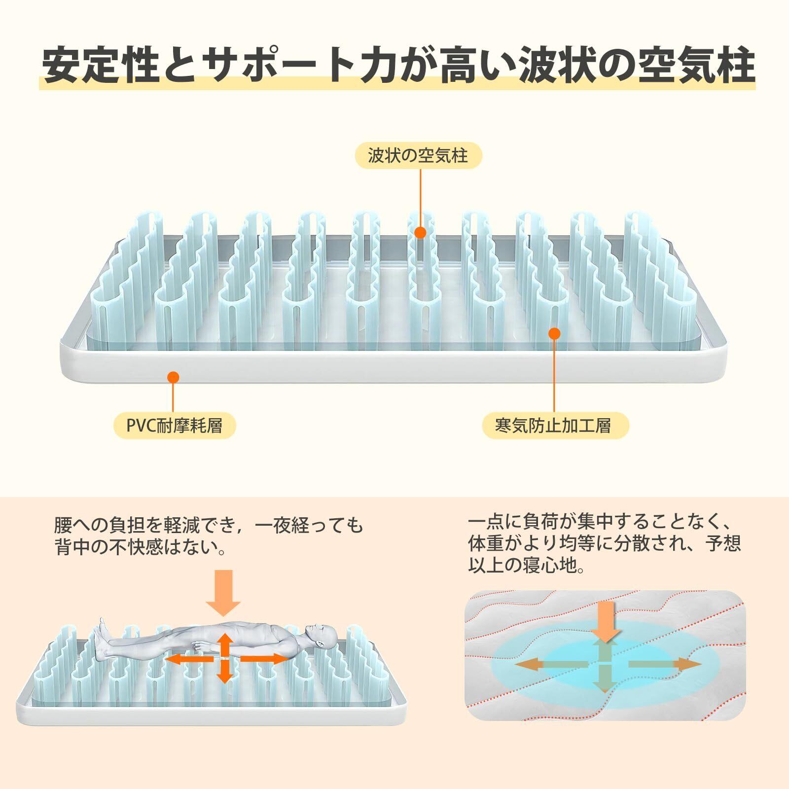 【寝心地抜群】十分に寝ていでも疲れを感じますか、或いは腰が痛くなることで目が覚めることがありますか。GOTIDYエアーベッドの内部は波構造の空気柱を採用され、体重を分割されてるので一点に負荷が掛かって沈み込まず、あまり沈まないので腰への負担が軽減されるので寝心地が良くなります。【硬さを調整可能】空気圧を調整することによって、エアーベッドの硬さをお好みに簡単調整して、低すぎず高すぎず丁度よい寝心地にできます。【柔らかい肌触り】当社このエアーベッドの表面は起毛素材を採用され、柔らかくソフトな仕上がりで、頬に触れても肌荒れせず、大人はもちろん子供でも楽しみにしています。柔らかさと快適さを兼ね備えているエアベッドです