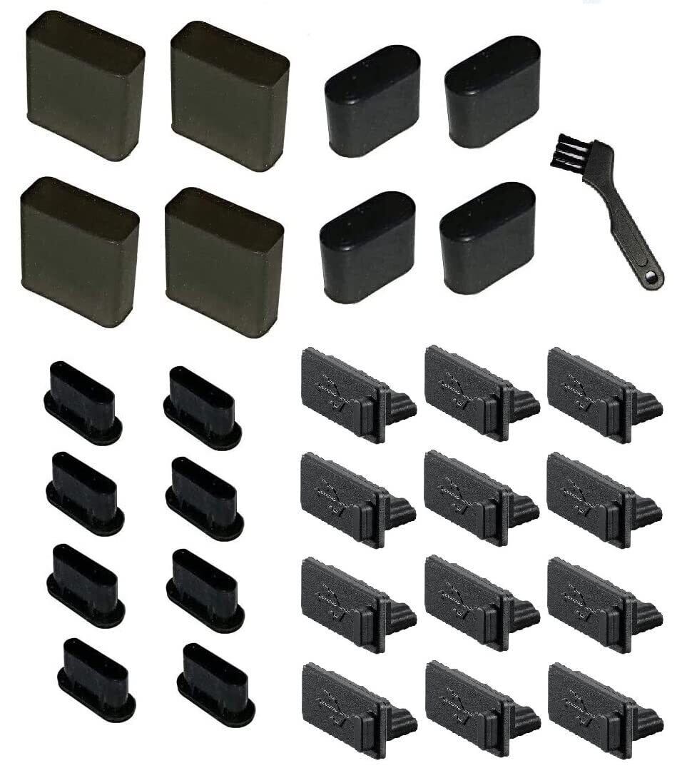 シリコン製 USB/USB TYPE-Cポート オス・メス用防塵保護カバー ( 4種類 計14個入 )×2セット 計28個 + すき間お掃除ブラシ コンパクト + F.Wave マイクトファイバー お手入れクロス付セットです。 合計4種類 の ノ-トパソコン用 USB/USB TYPE-Cポート オス・メス用 防塵保護カバー 合計28個入 セットです。 ご愛用品を傷つけません。
