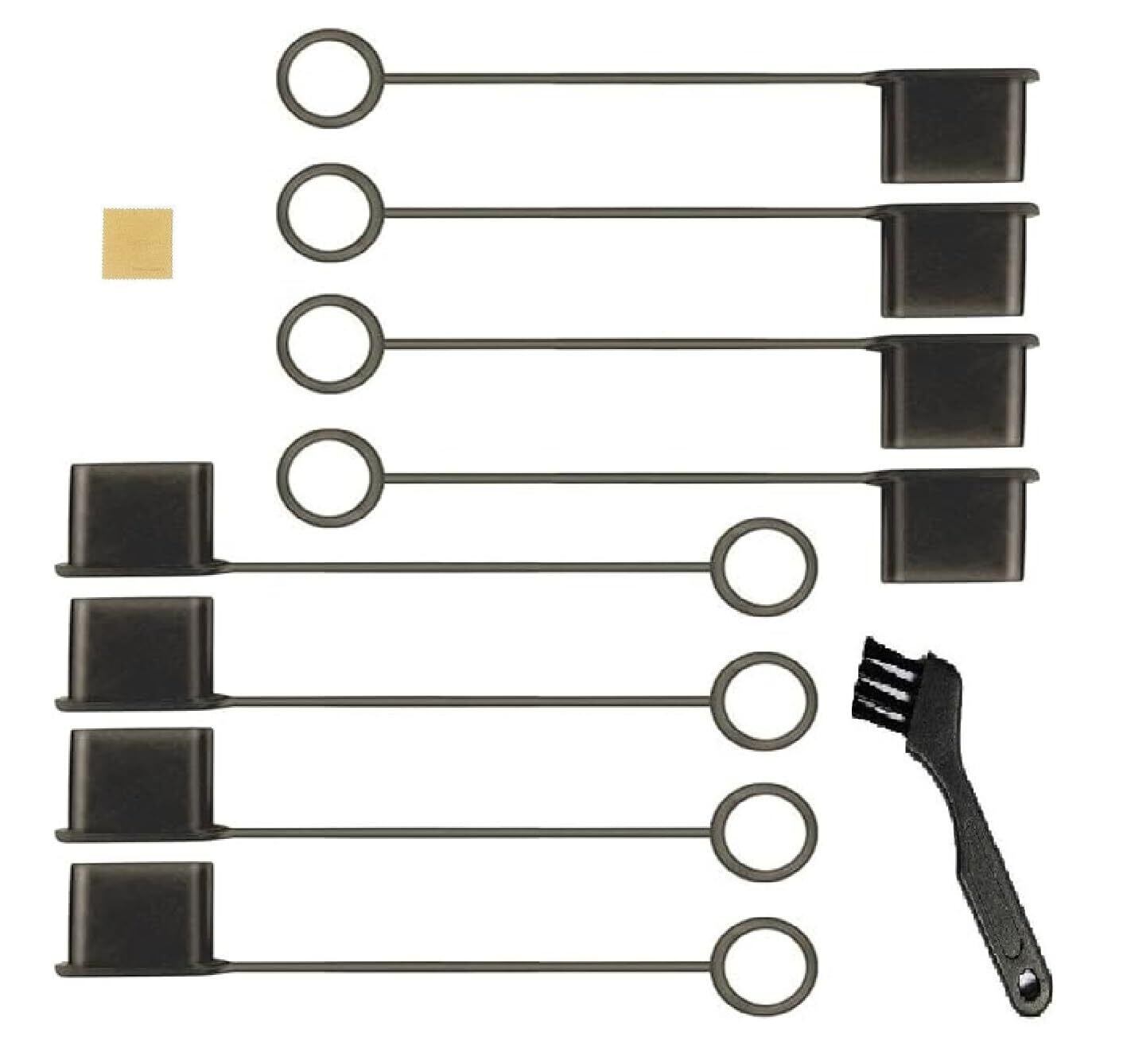 劣化しにくい、Hiグレードのシリコン製 & 落下防止機能付 USB A (オス)コネクタ用防塵保護カバー キャップ 計 8個 + F.Wave オリジナル レザー調 MicroFiber お手入れクロス ミニサイズ ( 持ち運びに便利、iPhoneのフロントガラスを含め、、製品全体の、ちょっとしたお手入れに最適です。何枚あっても、重宝します ) のセット内容です。