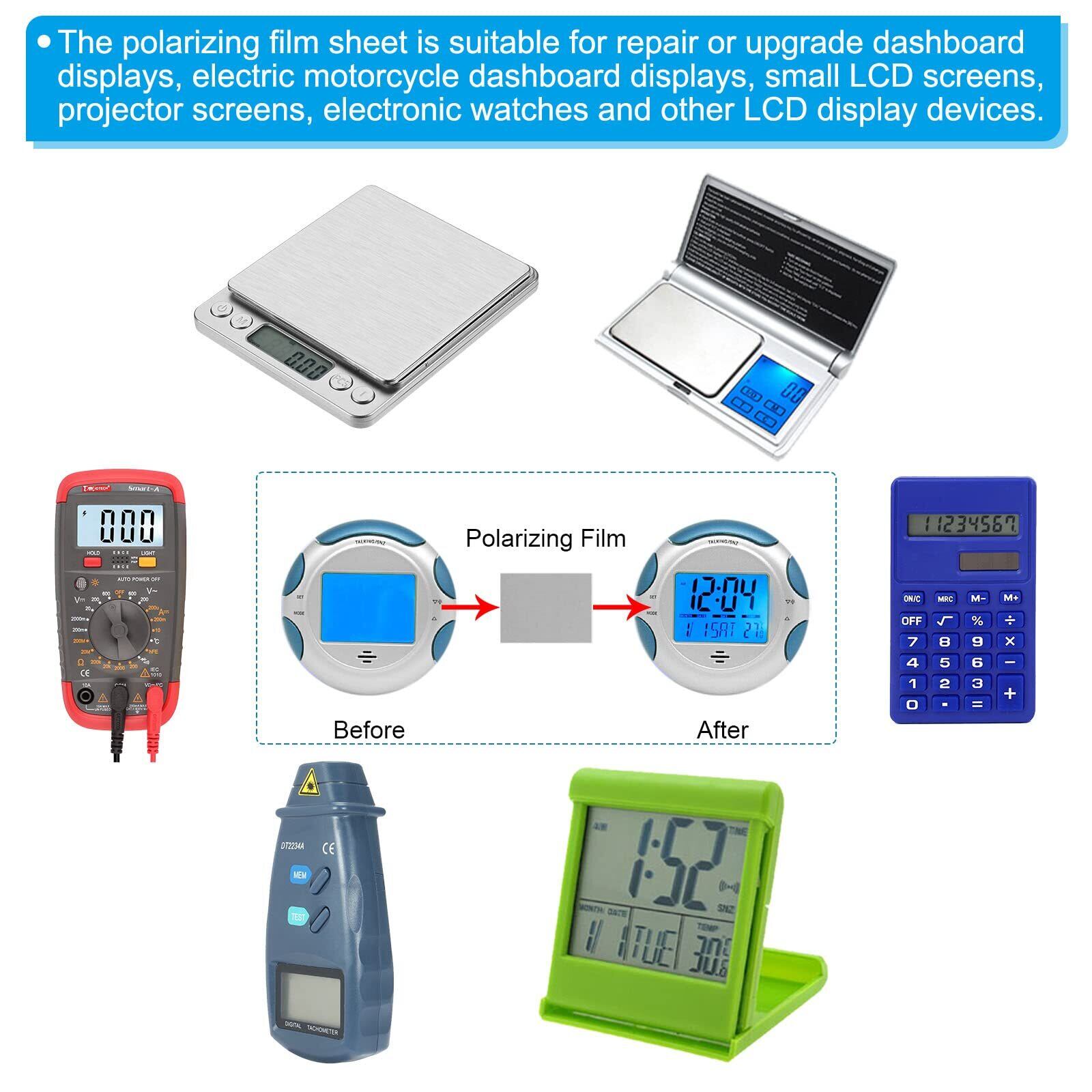 偏光フィルムシートは光散乱、偏光プロジェクト/実験、ダッシュボードディスプレイ、電動バイクダッシュボードディスプレイ、小型LCDスクリーン、プロジェクタースクリーン、電子時計、その他のLCDディスプレイデバイスの修理またはアップグレードに適しています。