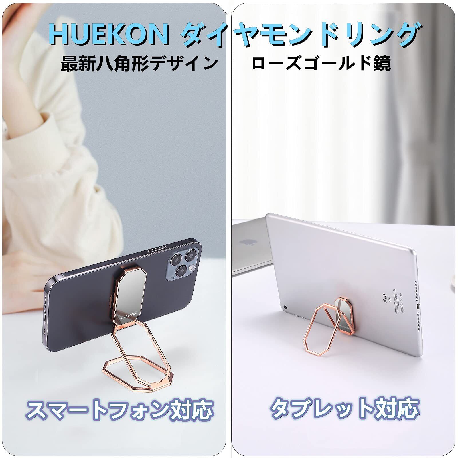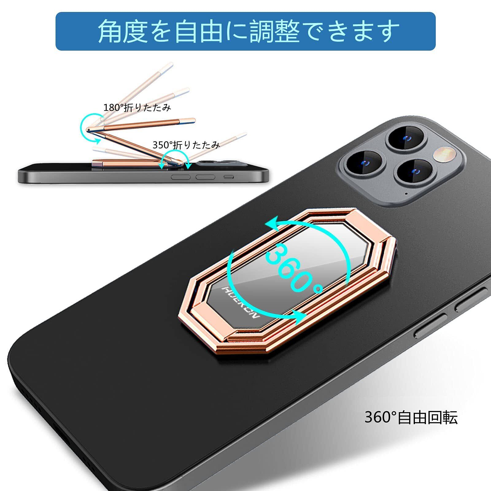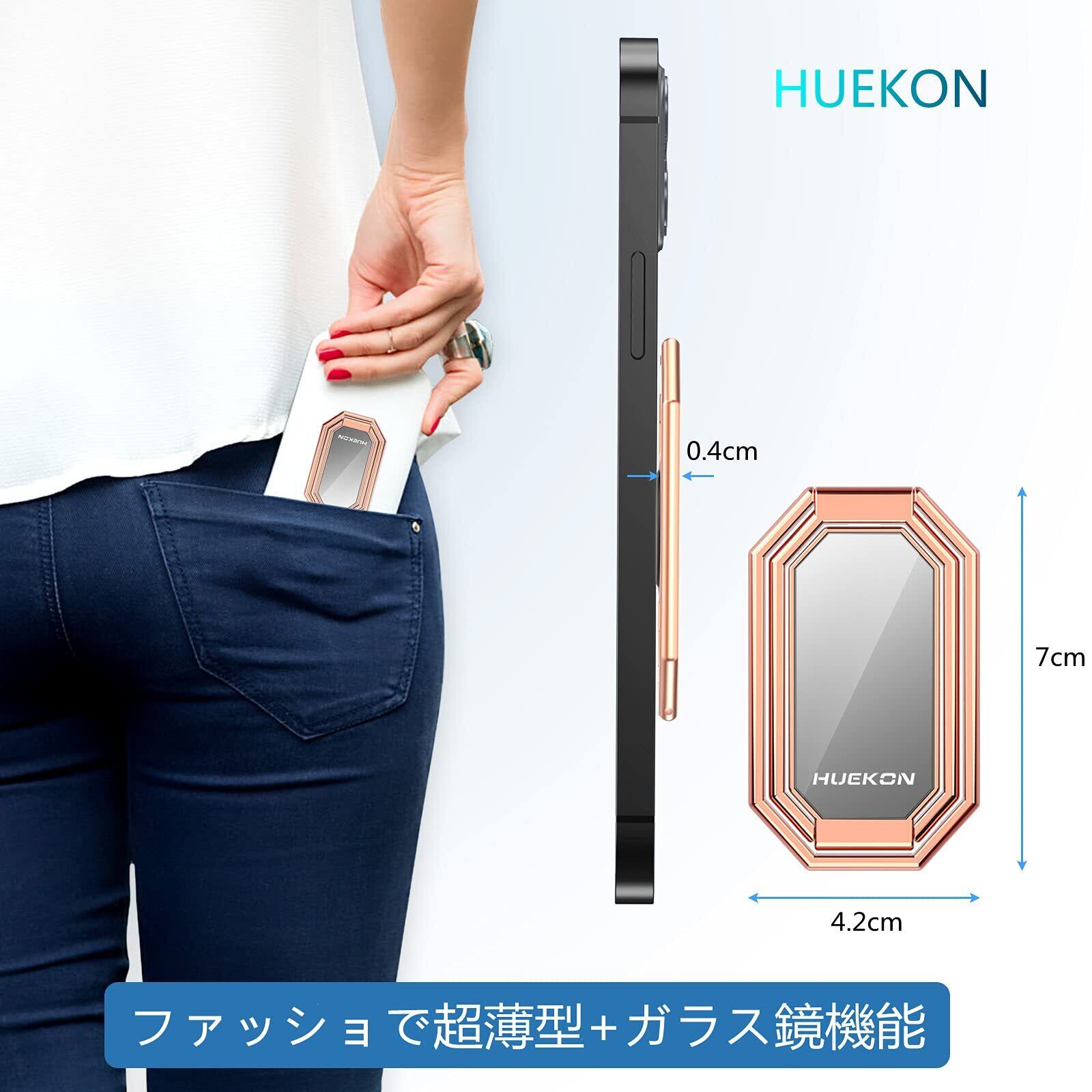 スマホリング【HUEKON2021年 縦置きできスマホリング、折りたたみ耐久性のあるバンカーリング、薄くて携帯に便利なすまほりんぐ、角度調整が可能な携帯リング、片手操作時に指にかけ落下を防げるホールドリング、粘着テープでしっかり固定できるスマホリング、交換用の5枚粘着テープと透明フィルムが付属.スマートフォン/タブレット/電子書籍リーダー/ケース各種他対応 (ローズゴールド鏡)