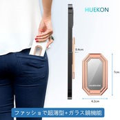 HUEKONスマホリングは光沢のあるローズカラー仕上げで、落ち着きの中にも華やかさのある女性に似合う仕上げになっています。また、リングの中央は突然の身だしなみのチェックにも使える鏡面仕上げになっています。それは鏡のようなものです。