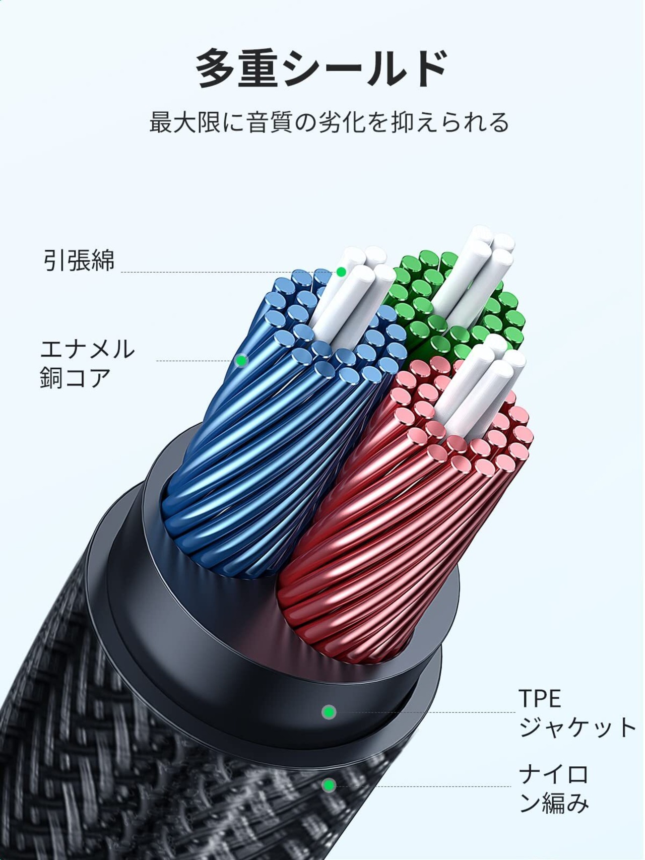 【柔軟性と耐久性 】:10000回以上の挿抜テストの金メッキコネクタと折り曲げテストのナイロン素材は、やわらかで絡まりにくく、取り回しやすいです。普通のオーディオケーブルよりも数倍の寿命を誇ります。