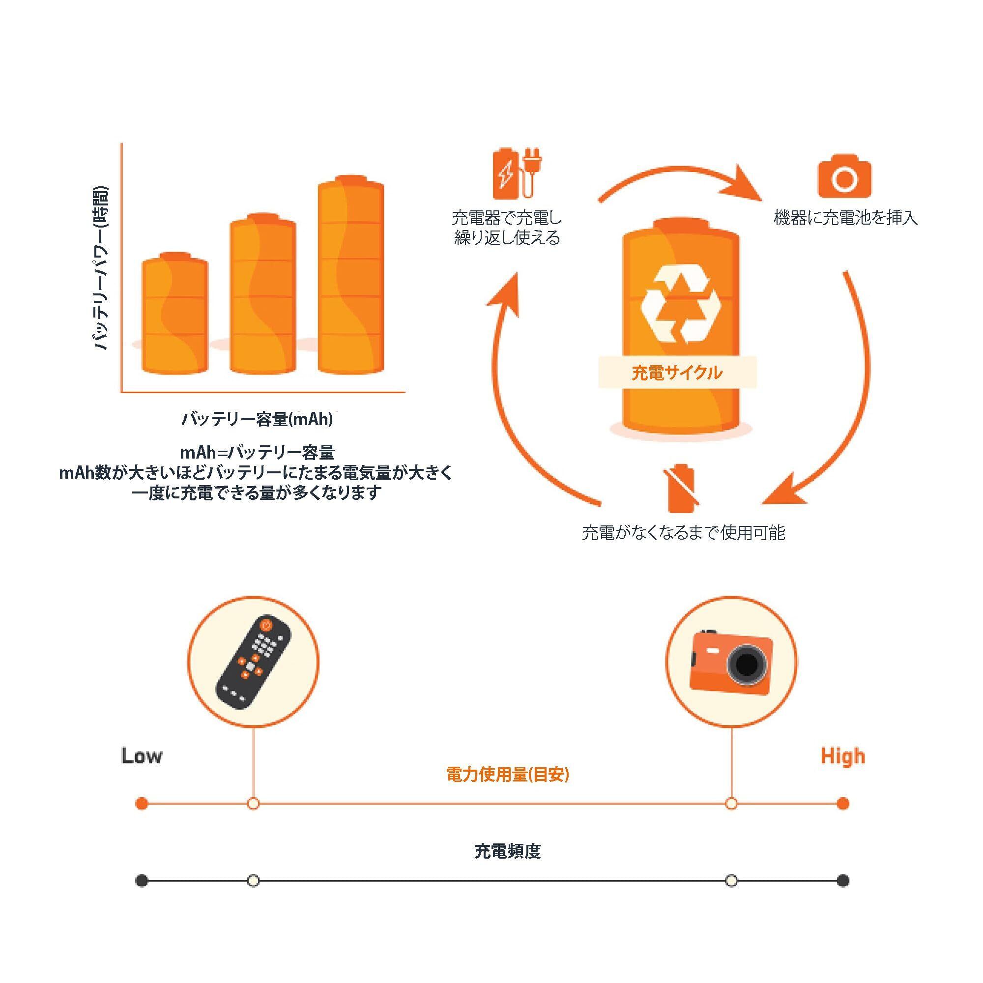 注:電池の損傷や望ましくない急激な放電を避けるため、次の組み合わせは避けてください: 充電式電池と充電式でない電池、完全に充電された電池と充電残量が中程度から低い電池、新しい電池と古い電池、mAh容量が異なる電池、異なるブランドの電池。