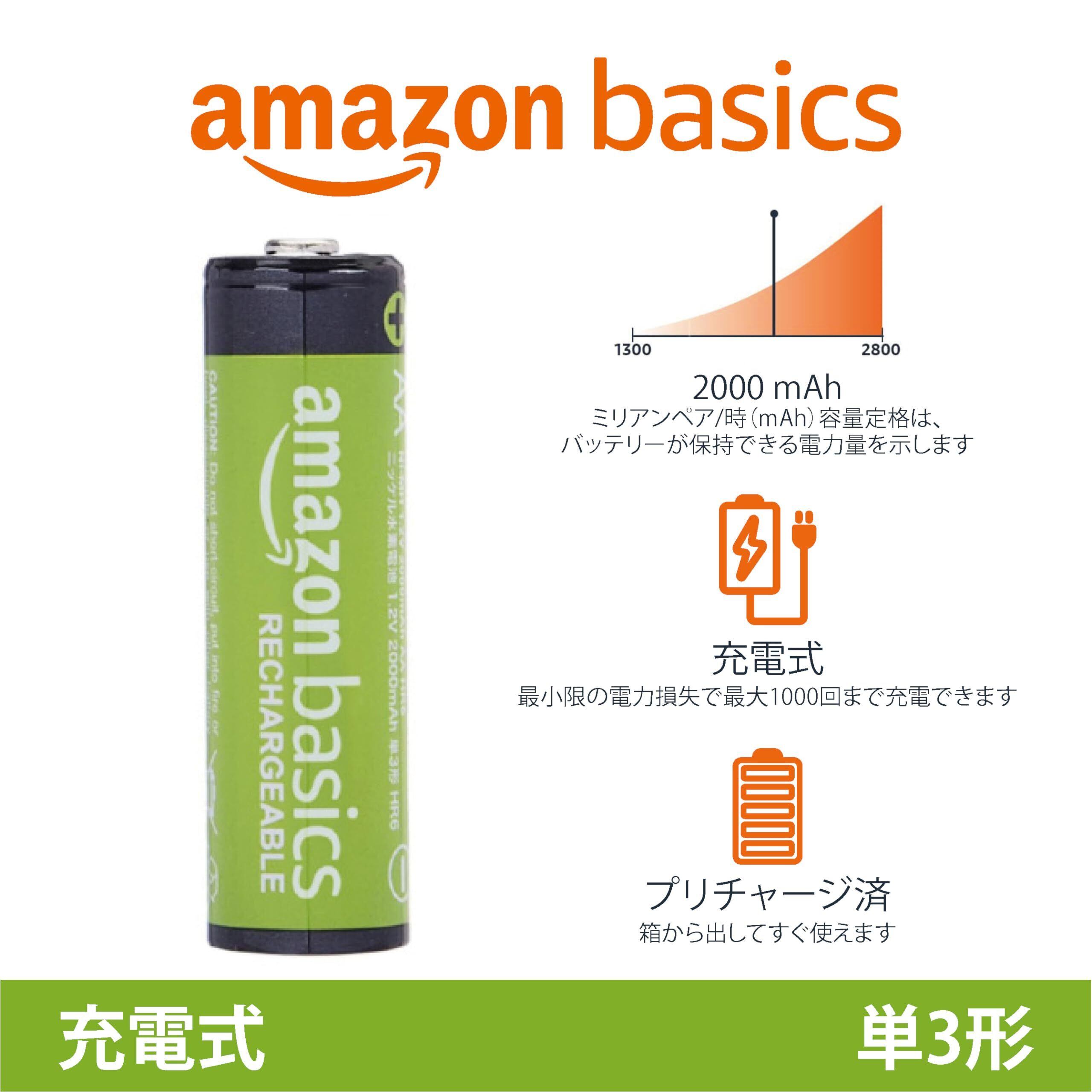 Amazon Basics 充電式単三ニッケル水素電池4個、2000mAh、1.2V、最大1000回まで充電可能、プリチャージ済み