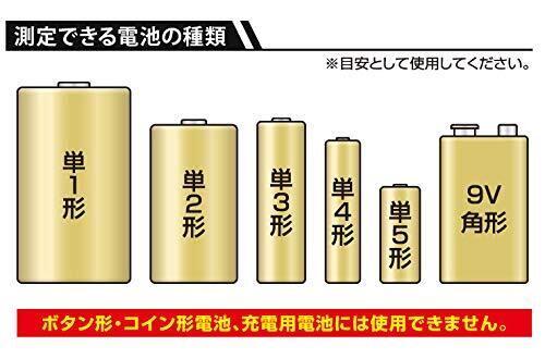 混じっていてもすぐに判別可能!新旧バラバラにしまった電池も電源不要でサッと確認。1.5Vの単1から単5形、9V角形電池を測定できます。※目安としてお使いください。電池チェッカー本体の電源は不要です。注)ボタン型・コイン型電池、充電用電池には使用できません。