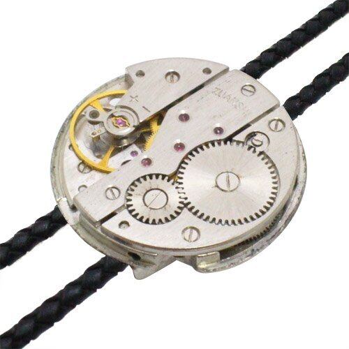 ビンテージの機械時計のムーブメントを使ったループタイ。 機械時計のパーツはビンテージの品を使用しているため、 若干の傷や薄い汚れなどがあり、ビンテージならではのより味わいのある雰囲気を醸し出しています。 スタイリッシュで存在感があり、胸元を男性らしく飾ってくれます。