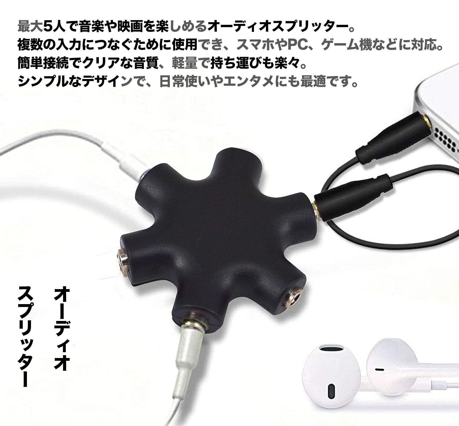 【マルチイヤホンスプリッター】【mybest掲載】 leeyovk イヤホンスプリッター,JP02280LY 安心の品質保証。オーディオ出力を複数の入力につなぐために使用。このイヤホン分配器は、最大5人で同時に音楽や映画を楽しめる、便利でシンプルなオーディオスプリッターです。自動的に入力と出力を判別し、様々なAUXポート搭載のデバイス(iPhone、スマートフォン、PC、ゲーム機など)に対応。音楽機器やスピーカー、Bluetoothオーディオレシーバーとも簡単に接続可能です。