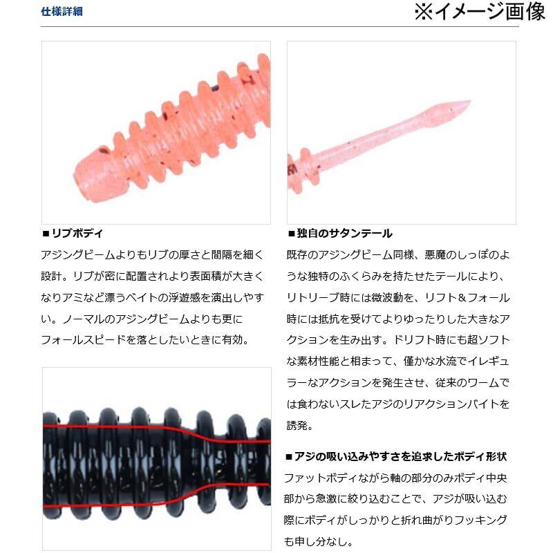 独自のサタンテール 既存のアジングビーム同様、悪魔のしっぽのような独特のふくらみを持たせたテールにより、リトリーブ時には微波動を、リフト&フォール時には抵抗を受けてよりゆったりした大きなアクションを生み出す。ドリフト時にも超ソフトな素材性能と相まって、僅かな水流でイレギュラーなアクションを発生させ、従来のワームでは食わないスレたアジのリアクションバイトを誘発。