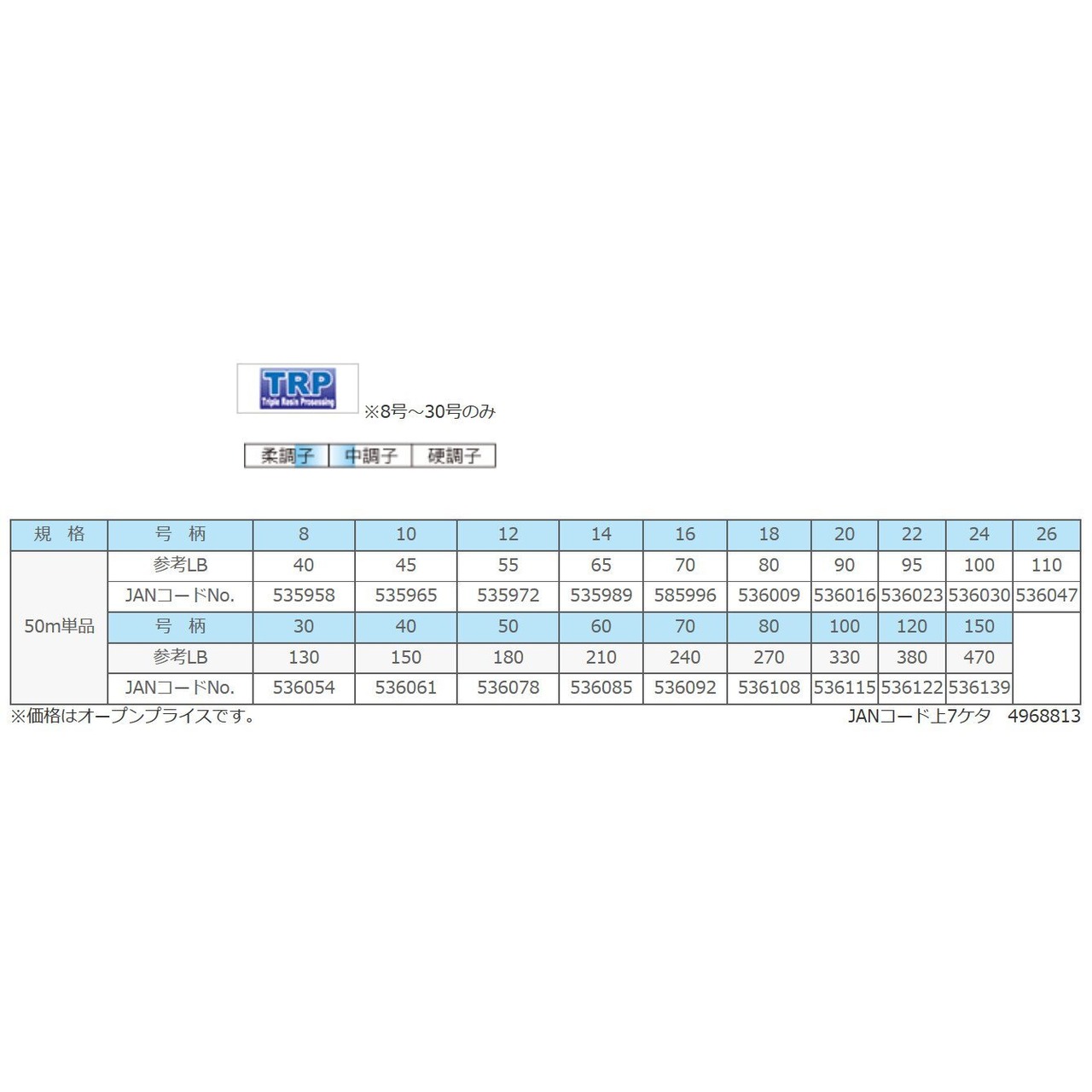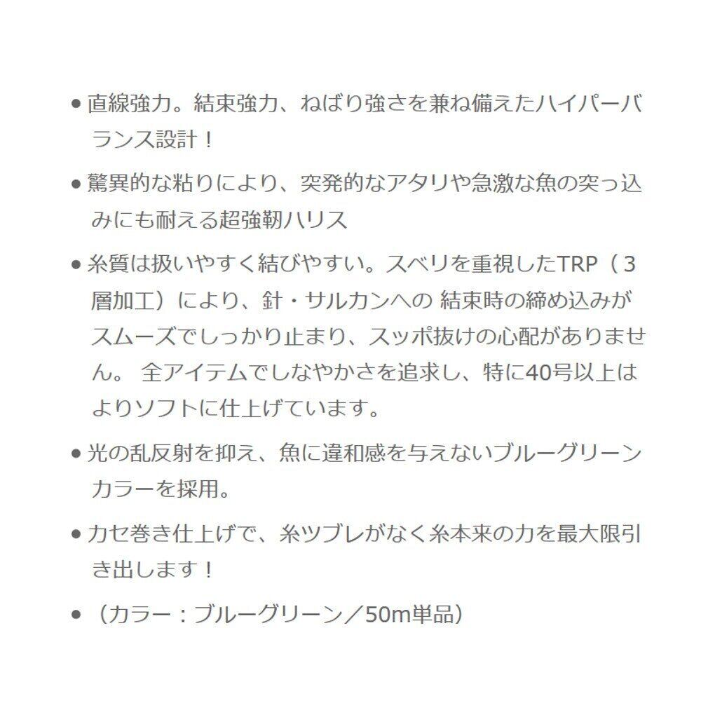 ●直線強力。結束強力、ねばり強さを兼ね備えたハイパーバランス設計! ●驚異的な粘りにより、突発的なアタリや急激な魚の突っ込みにも耐える超強靭ハリス。 ●糸質は扱いやすく結びやすい。スベリを重視したTRP(3層加工)により、針・サルカンへの結束時の締め込みがスムーズでしっかり止まり、スッポ抜けの心配がありません。 全アイテムでしなやかさを追求し、特に40号以上はよりソフトに仕上げています。 ●光の乱反射を抑え、魚に違和感を与えないブルーグリーンカラーを採用。 ●カセ巻き仕上げで、糸ツブレがなく糸本来の力を最大限引き出します! ※TRP(8号〜30号のみ)