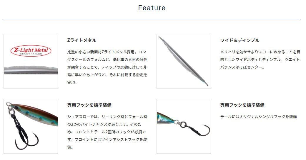 ソルトウォーターゲームシーンで数々の実績を積み上げてきたショアスロー。ターゲットの垣根を超えて、多彩な魚種を狙うことができるゲームスタイルが、いよいよフレッシュウォーターシーンでも、その実力を発揮します。湖をメーンフィールドに、ターゲットは大型トラウトからバスまで、ソルトゲーム同様、様々なターゲットを照準におさめます。シーズンを通してテストすることで見えてくる可能性は深く、そして意外性を秘めています。"見せて、そして喰わせる" ショアスローならではの魅力を是非新たなるフィールドで実感してください。○スローに、そして魅せる。 ディンプルシェイプのクレーター。ややワイドなシルエットのスローブラットキャストクレーター・レイクショアスローモデル。マテリアルに採用したZライトメタルとも相まって、よりスローなフォールでトラウトの食性に訴えます。また、ディンプルをボディ表面に配置することで、スローフォールを実現し、同時に複雑なフラッシングを発揮します。テンションフォールでは一層のアピールを生み出し、フリーフォールではジグザグの軌跡で魅せます。スローブラットキャストロングとの使い分けで、より深くレイクショアスローを楽しんでいただくことができるモデルです。