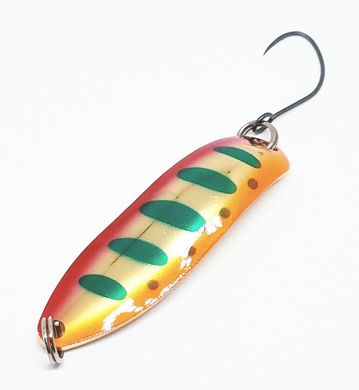 「フロントワイド」。今でこそ聞かれるようになった形状ですが、じつは始まりがこのフィールド用バックスです。急流の流れにスプーンを乗せ、Uターンさせると最後は逆引きになります。オーソドックスな形状ではどうしても浮き上がり、足元まで引ききることは不可能です。逆転の発想「前頭部幅広形状」すなわちフロントワイドを世に問うた世界初のアイテムです。